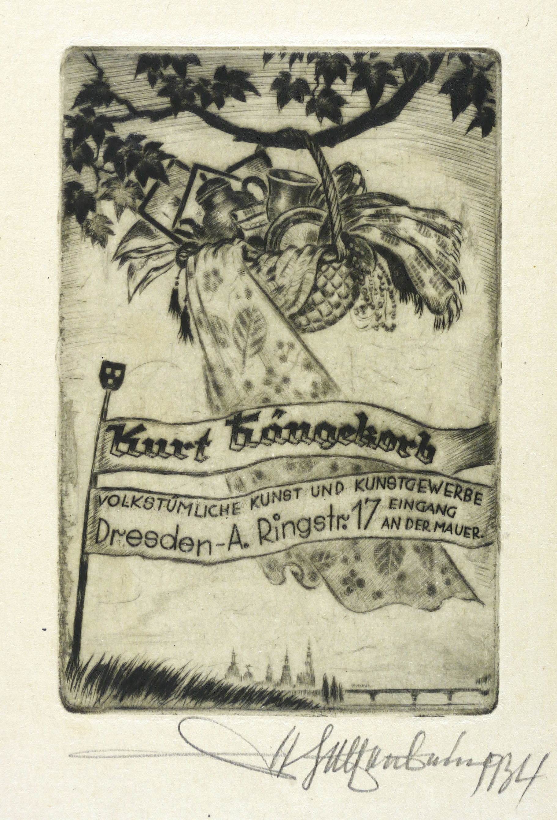 Rechts unten in Bleistift signiert und datiert: ″W. Helfenbein 1934″. In der Platte Inschrift: ″Kurt Hängekorb″. // VOLKSTÜMLICHE KUNST UND KUNSTGEWERBE Dresden-A. Ringstr. 17 EINGANG AN DER MAURER″. – Im linken Blattrand gering fleckig. Mäßig guter Zustand.