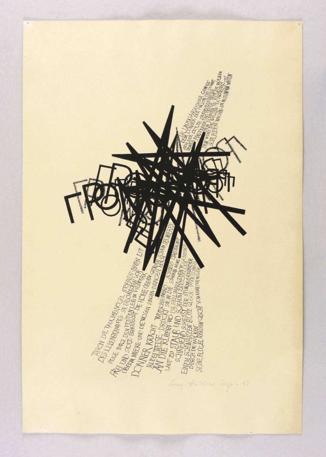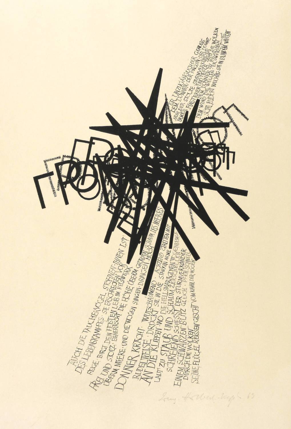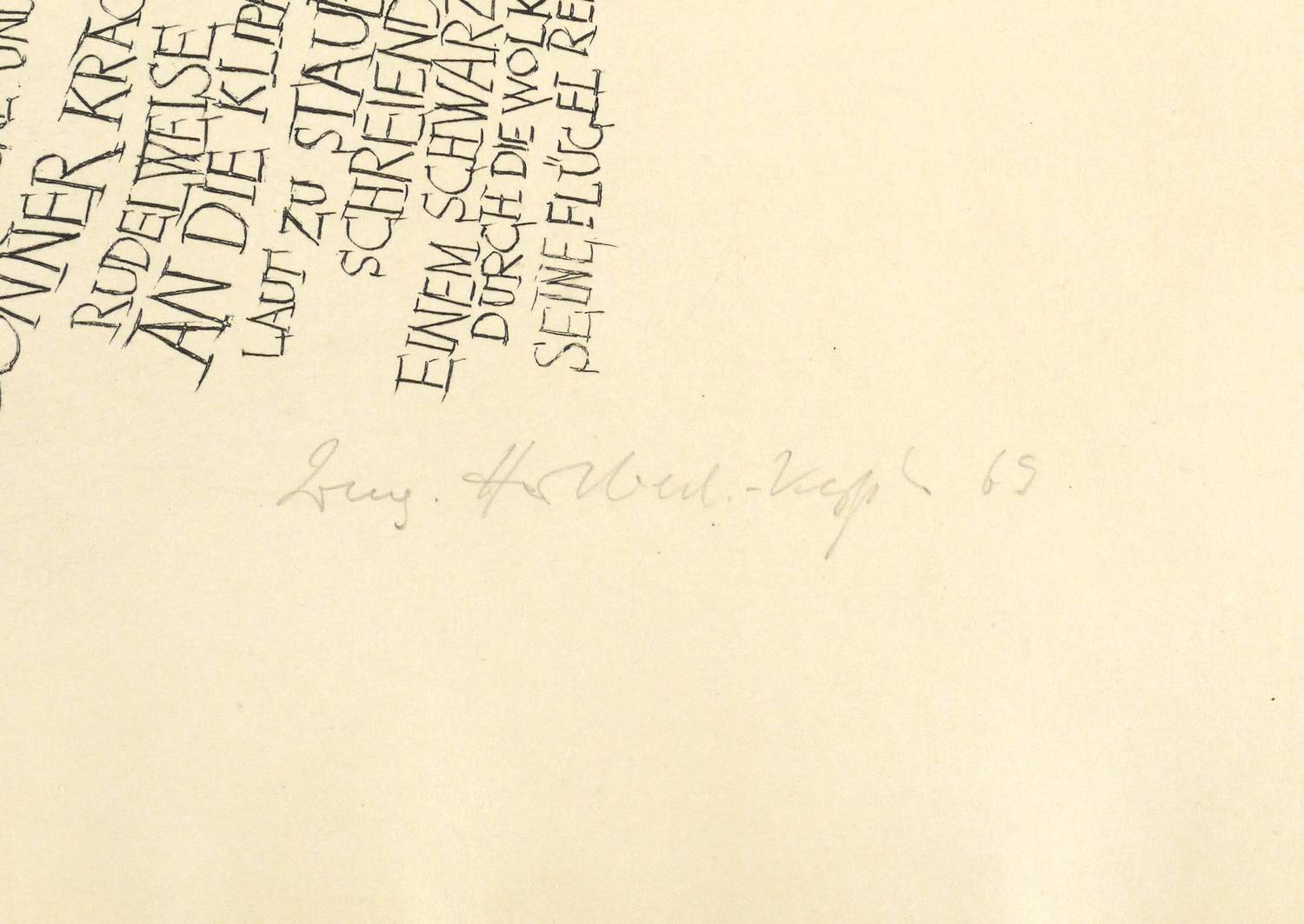 1969. Lithografie / Federlithografie, in Schwarz, auf glattem gelbem Kupferdruckkarton. – Originale Künstlergrafik, von Irmgard Horlbeck-Kappler. – Auflage 35 Exemplare. – 36,7 x 22,0 cm (Darstellung / Druckbild), 50 x 34 cm (Blatt).