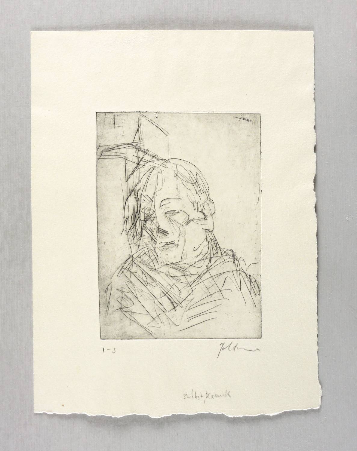 1986. Radierung / Strichätzung, in Schwarz, mit Plattenton, auf hellgelbem Velin. – Originale Künstlergrafik, von Dieter Goltzsche. – Auflage Exemplar Nr. 1/3. – 15,1 x 10,9 cm (Darstellung / Platte), 26 x 19 cm (Blatt).