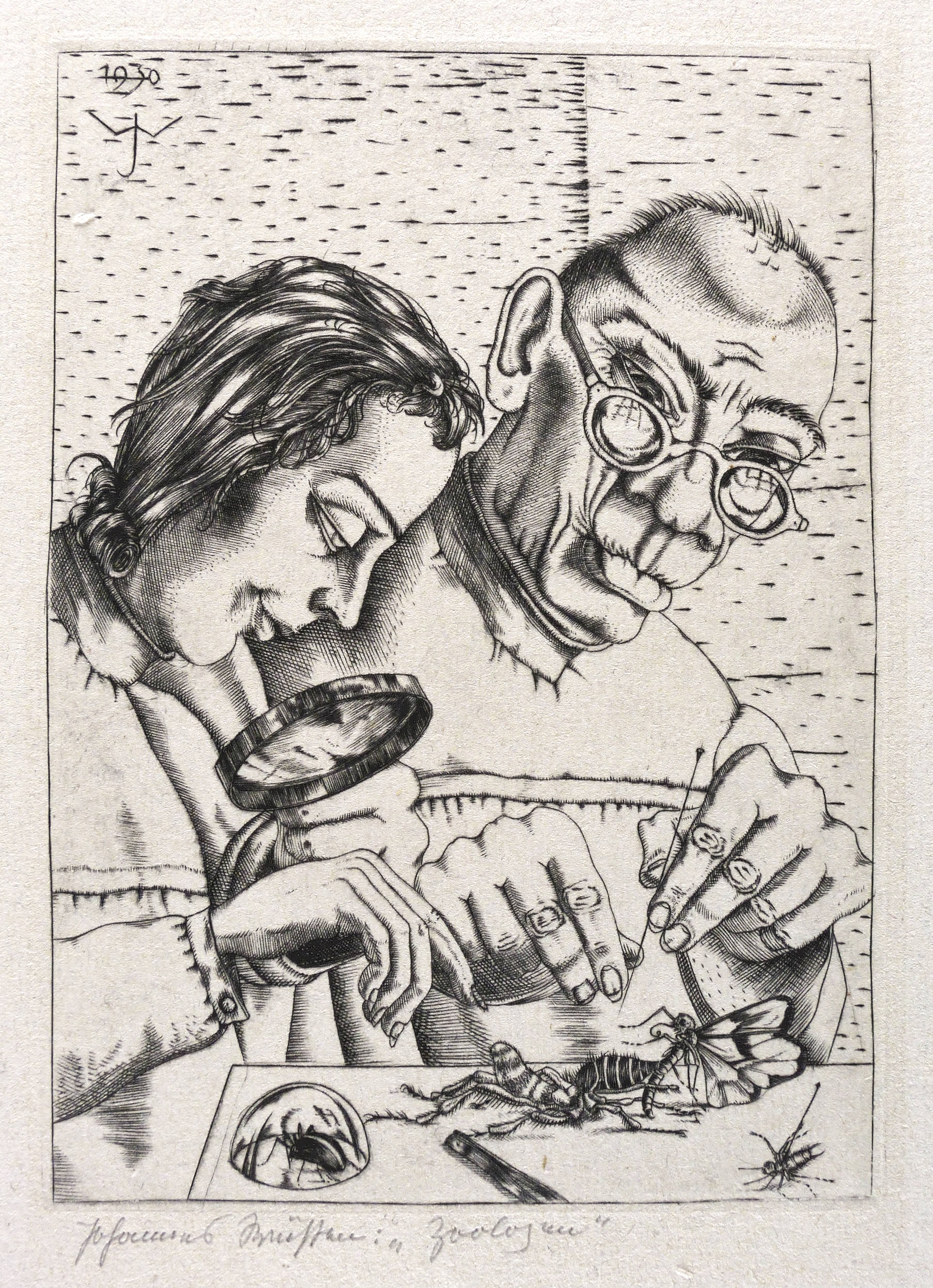 Links unten in Bleistift signiert und bezeichnet: ″Johannes Wüsten: 'Zoologen'″. In der Platte links oben ligiertes Monogramm und Jahr: ″1930 JW″. – Schwach ausgeprägter Fingerfleck im rechten Blattrand. Kaum wahrnehmbarer Lichtrand um die Platte. Insgesamt guter bis sehr guter Zustand.