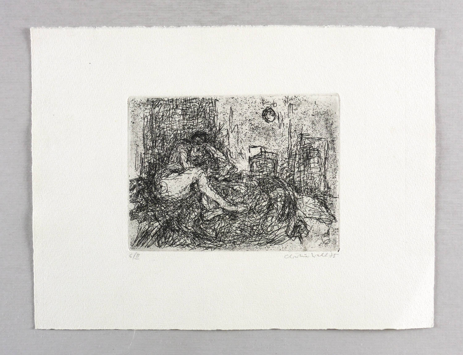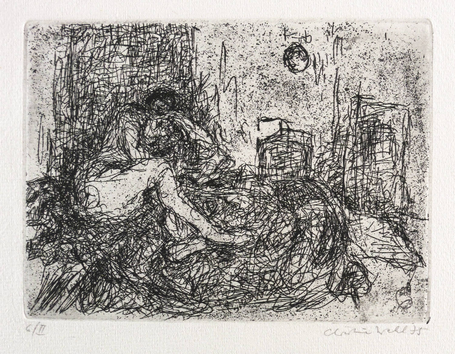 1975. Radierung / Strichätzung, in Schwarz, auf hellgelbem Maschinenbütten. – Originale Künstlergrafik, von Christine Wahl. – Auflage Exemplar Nr. 2/6. – 10,4 x 13,9 cm (Darstellung / Platte), 20 x 27 cm (Blatt).