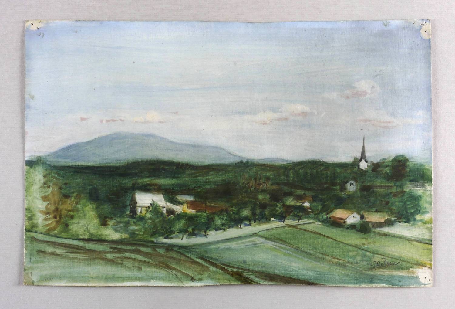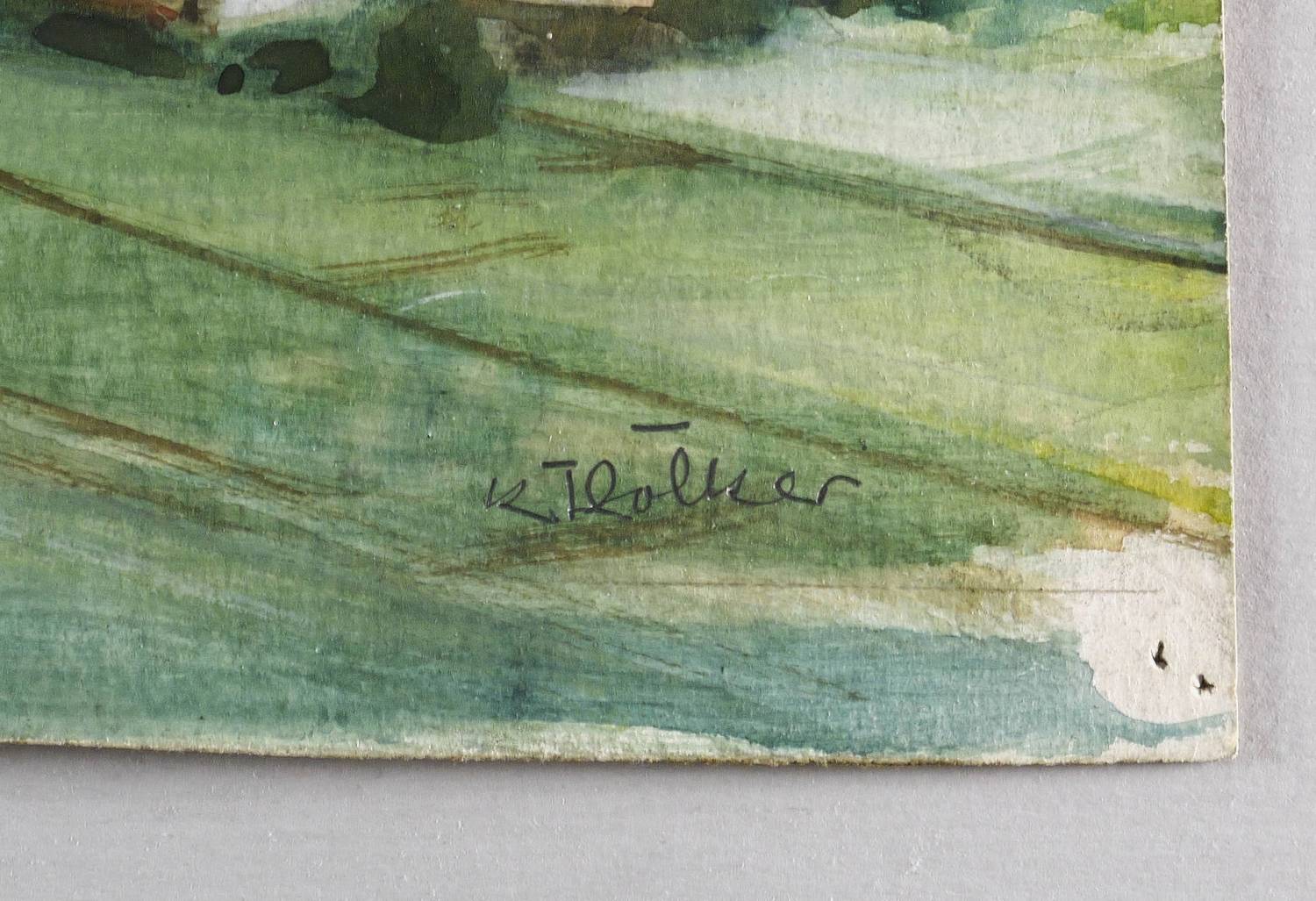 Rechts unten in Bleistift signiert: ″K. Völker″. – Bei der Hügelkette im Hintergrund könnte es sich um den Wurmberg bei Braunlage im Harz handeln. – In den Blattecken originale Reißzwecklöchlein. Sehr guter Zustand.