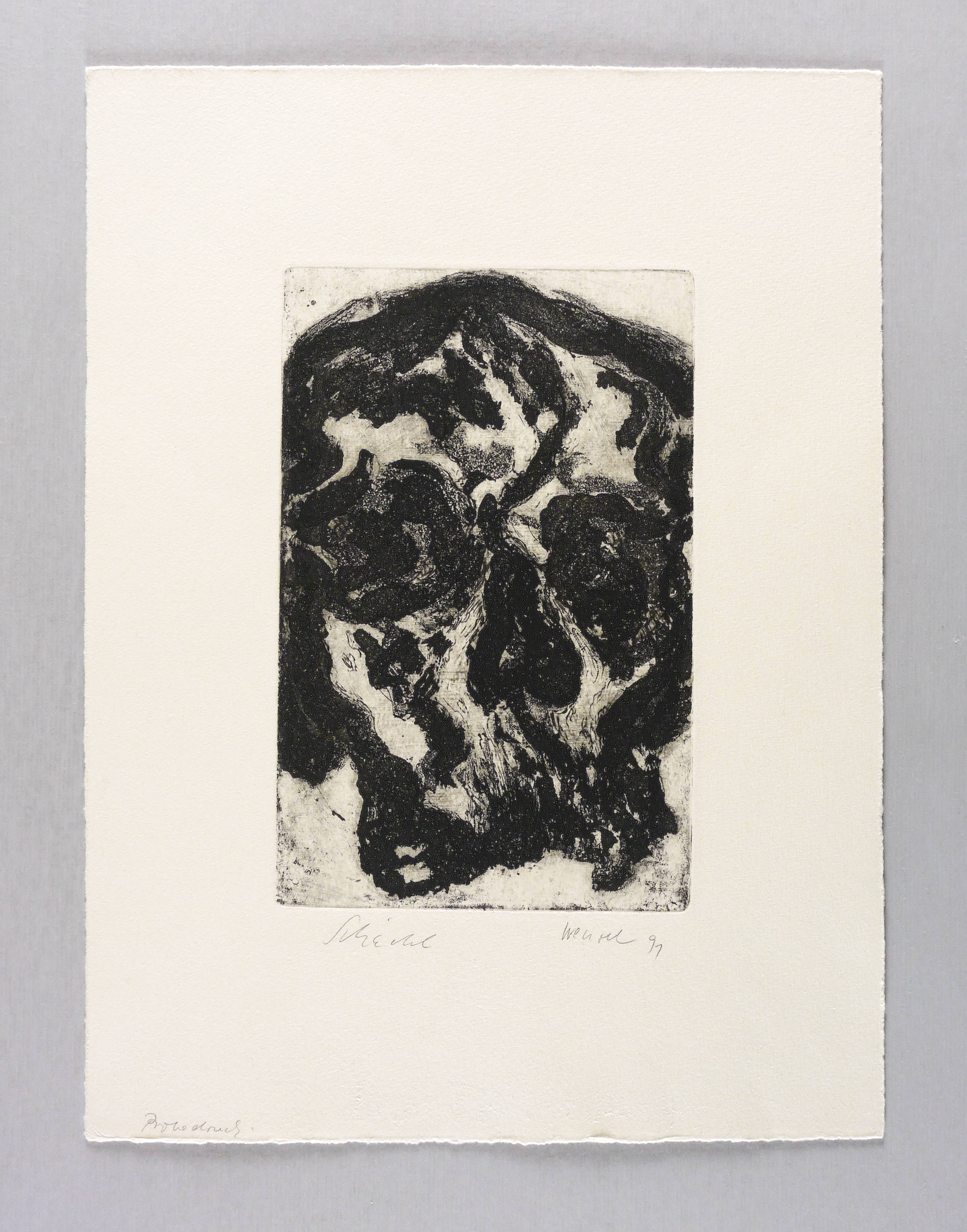 1991. Radierung / Aquatinta & Reservage, in Schwarz, auf chamois Bütten. – Originale Künstlergrafik, von Jürgen Wenzel. – Probedruck. – 23,9 x 15,5 cm (Darstellung / Platte), 40 x 30 cm (Blatt).