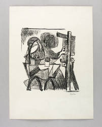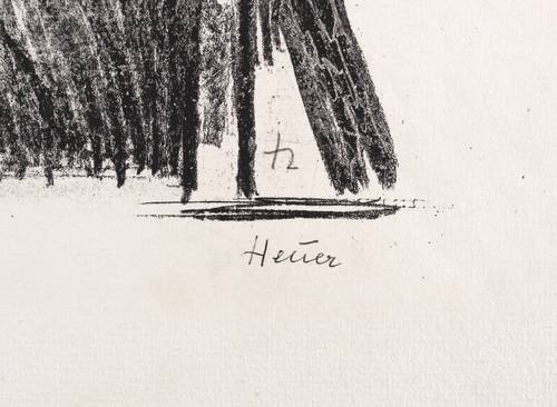 Um 1980. Lithografie / Kreidelithografie, in Schwarz, auf hellgelbem Maschinenbütten. – Originale Künstlergrafik, von Joachim Heuer. – 24,5 x 22,0 cm (Darstellung / Druckbild), 43 x 32 cm (Blatt).
