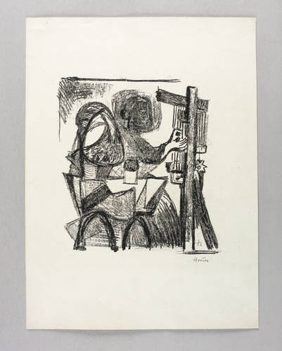 Rechts unten in Bleistift signiert mit ligiertem Monogramm: ″JH″. Darunter in Kugelschreiber nochmals signiert: ″Heuer″. Verso in Bleistift Titel: ″Am Webstuhl″. – Sehr guter Zustand.