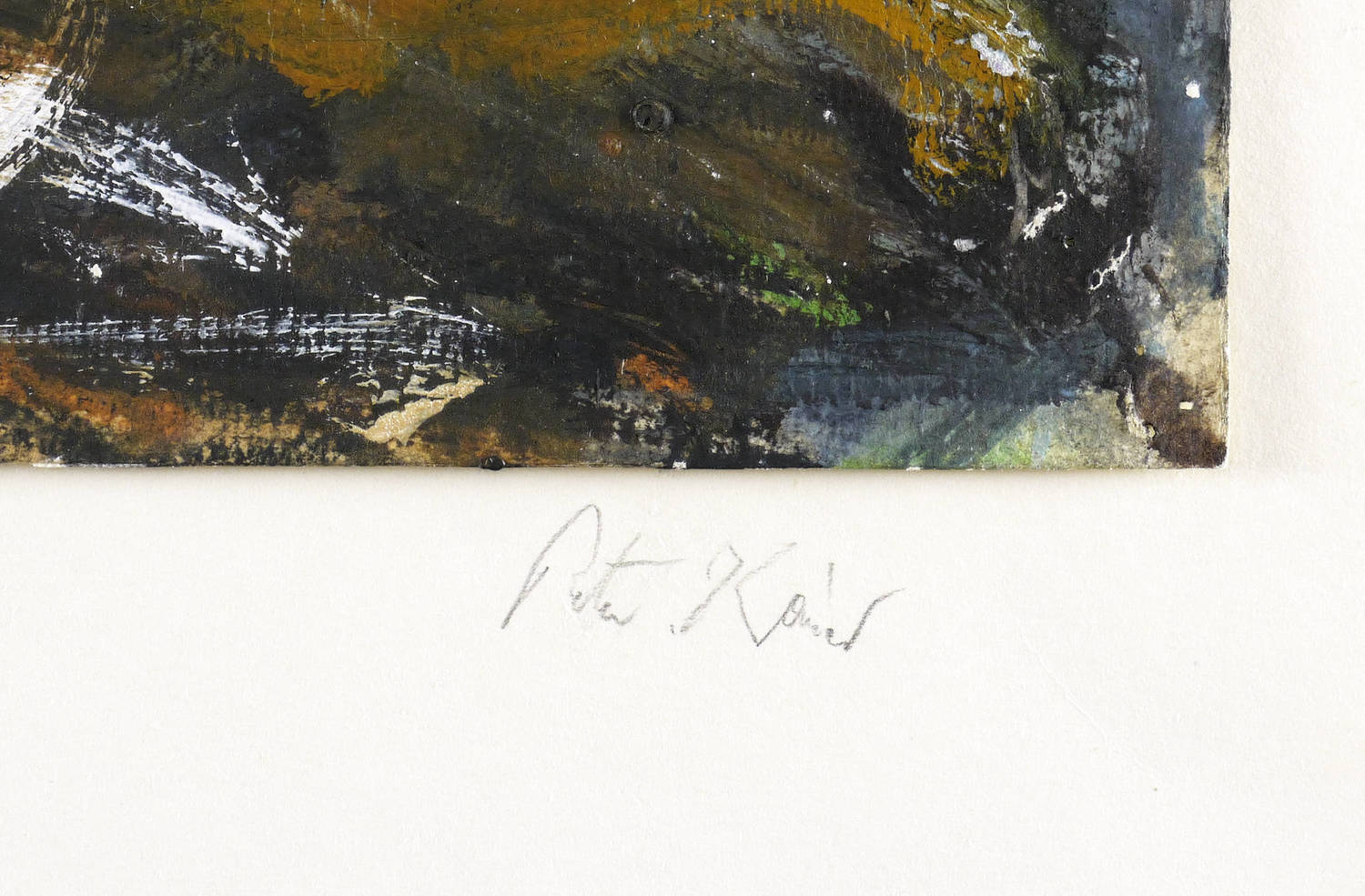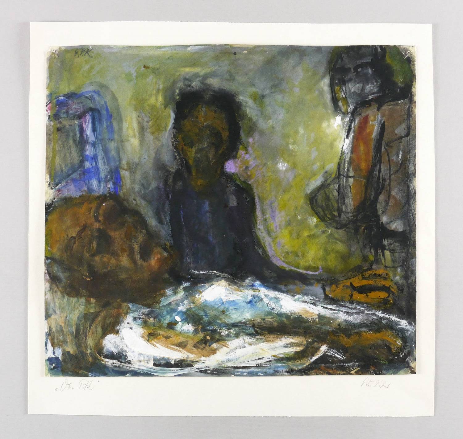 In der Darstellung links oben in Bleistift signiert: ″F.P.K.″ Auf dem Trägerkarton rechts unten nochmals: ″Peter Kaiser″. Links bezeichnet: ″Ohne Titel″. Verso nochmals: ″Peter Kaiser″. – Provenienz: Sammlung Dr. Ingrid und Prof. Dr. Albrecht Scholz, Dresden. – Vom Künstler auf Trägerkarton montiert. Sehr guter Zustand.