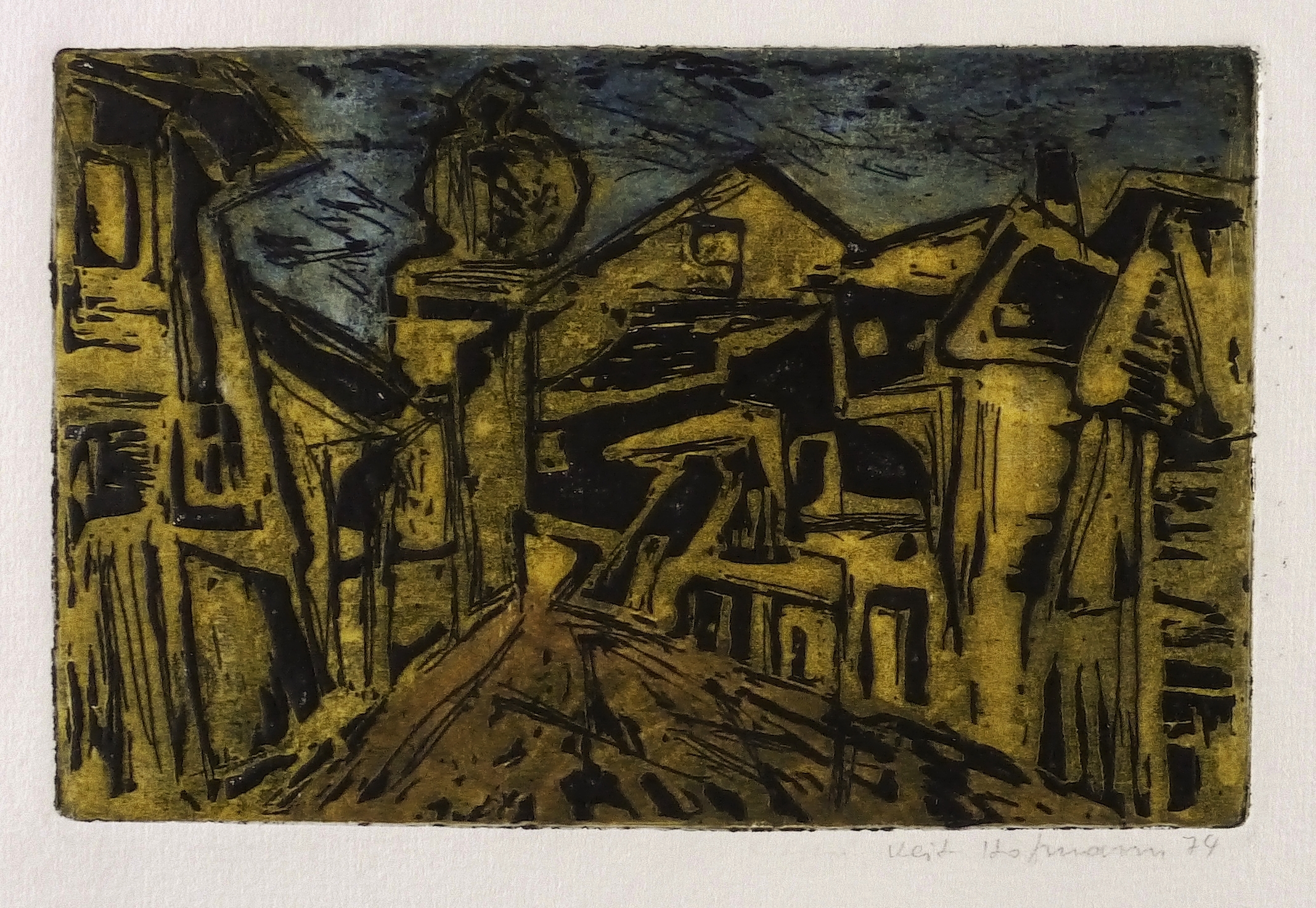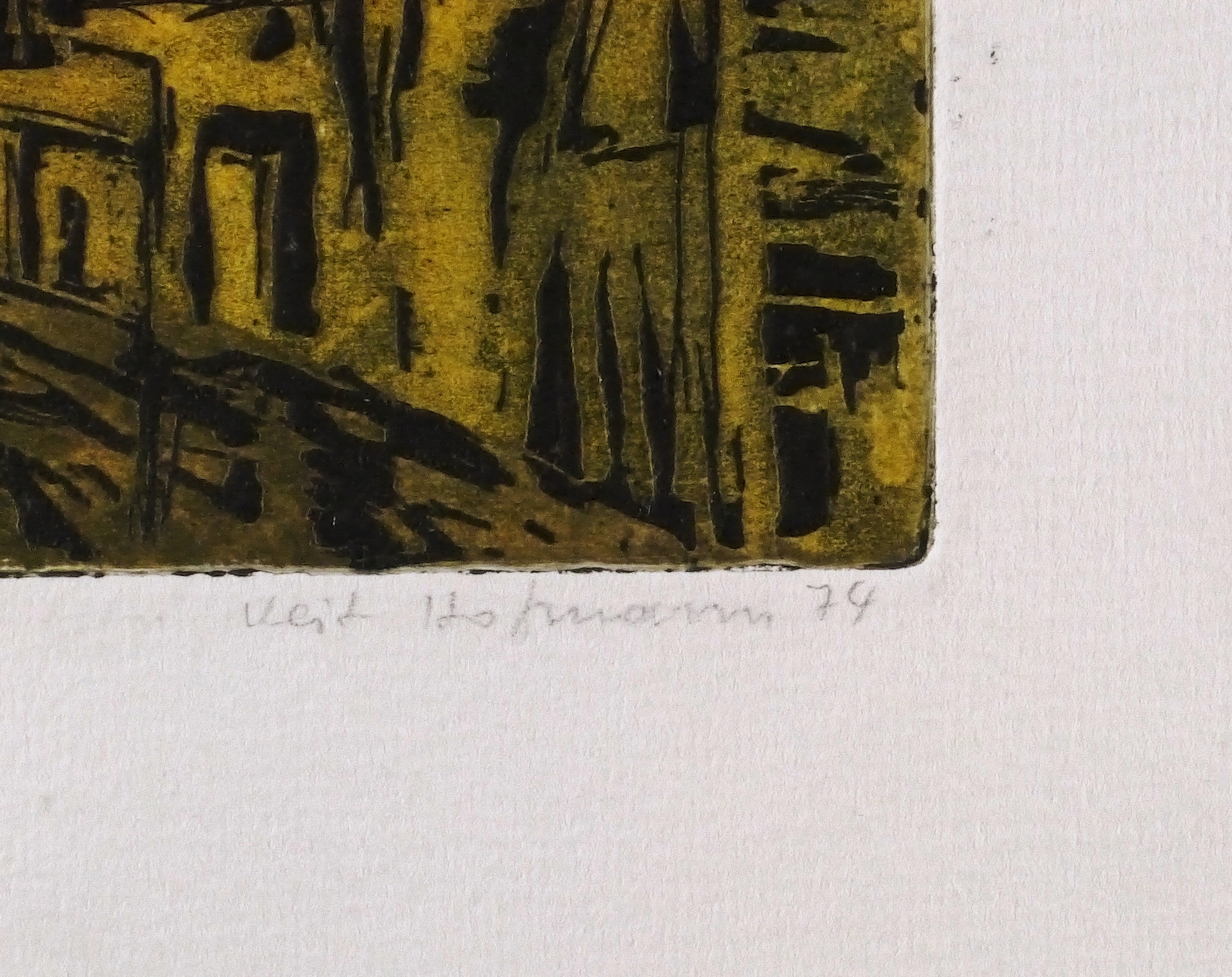 1974. Farbradierung / Aquatinta, in Blau, Gelb & Schwarz, auf hartem hellchamois Weißenborn. – Originale Künstlergrafik, von Veit Hofmann. – 12,1 x 18,8 cm (Darstellung / Platte), 25 x 35 cm (Blatt).
