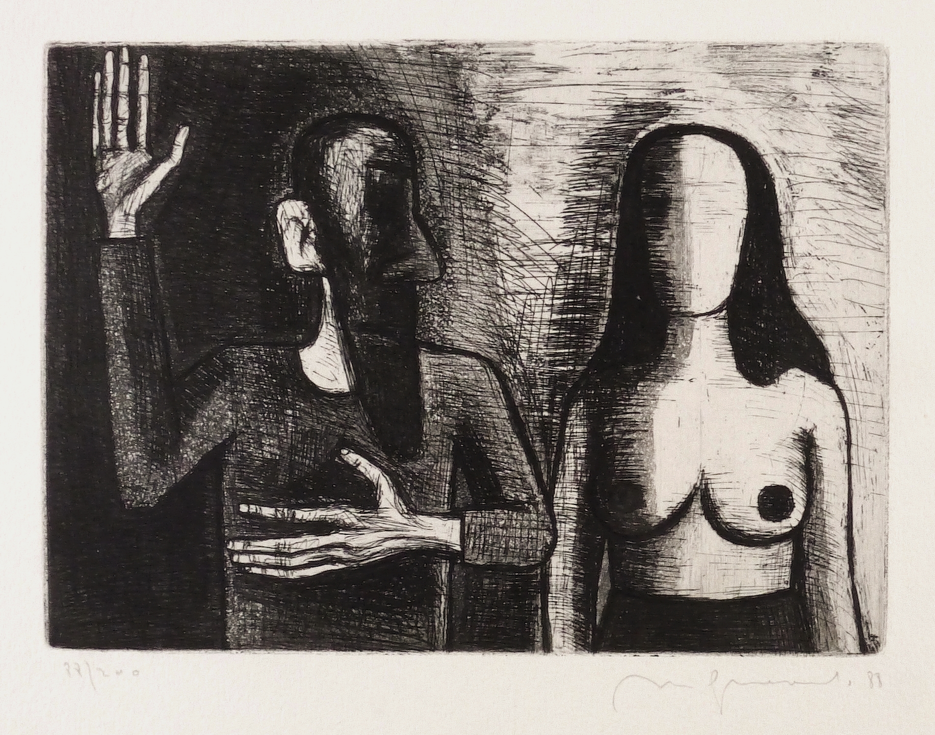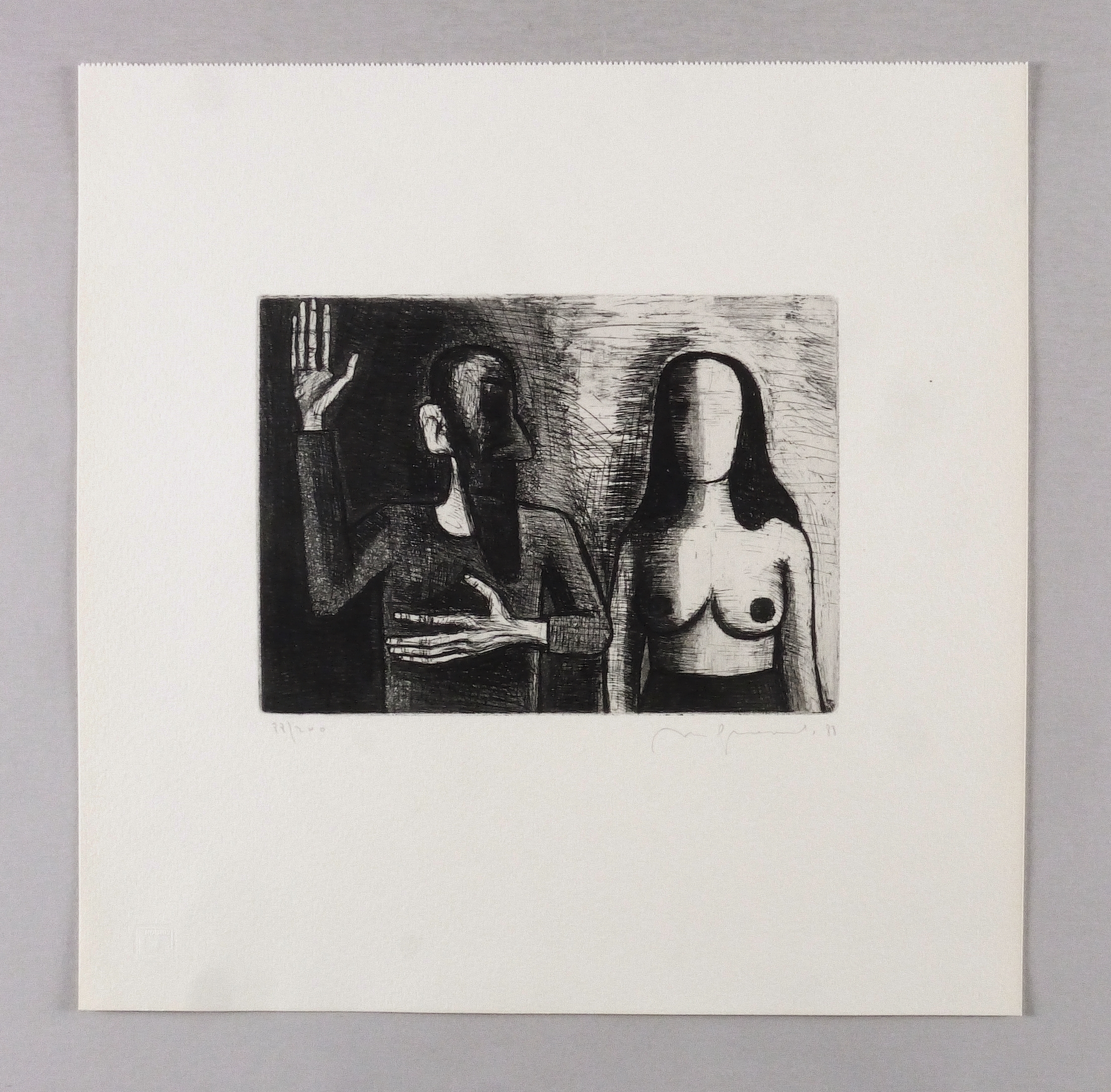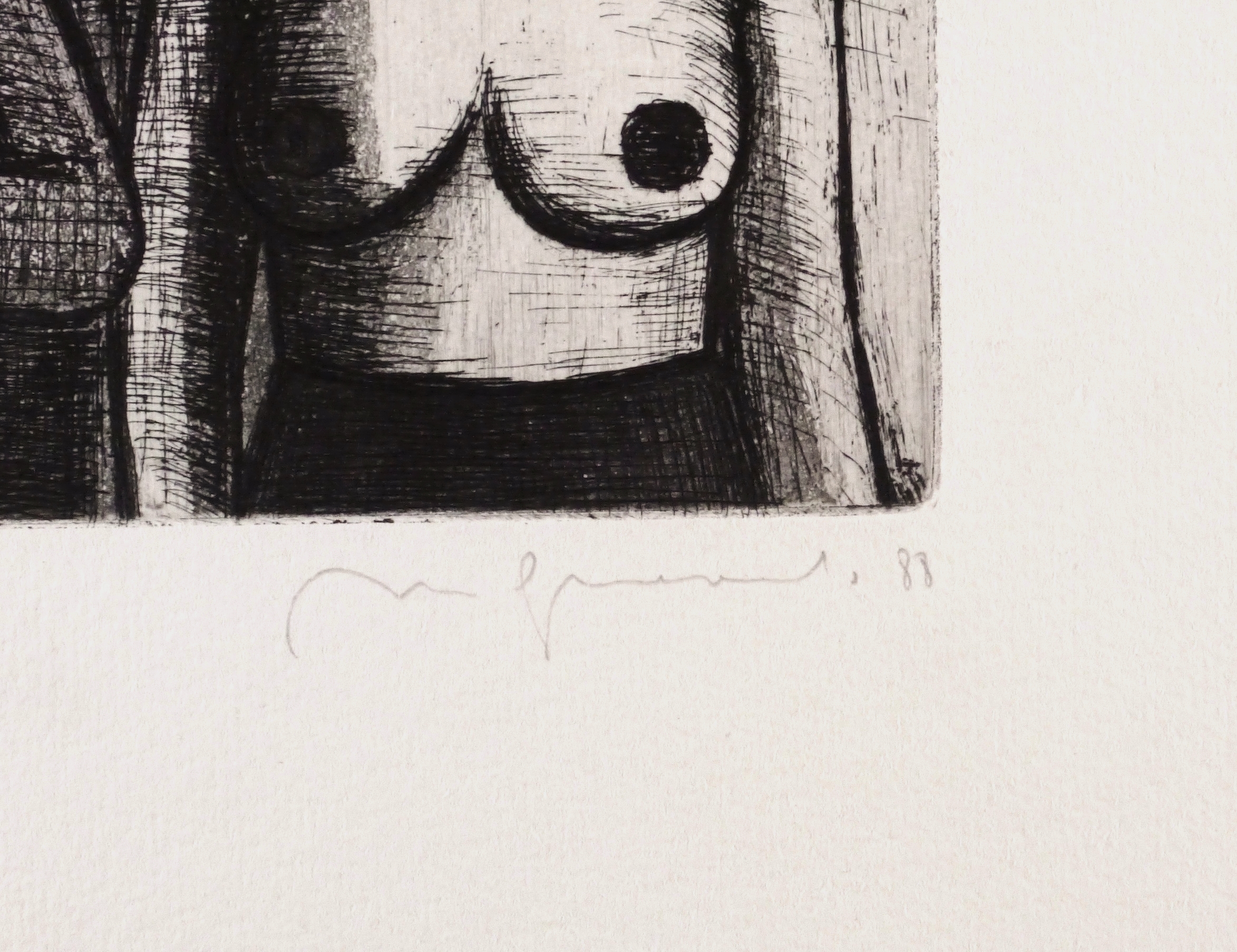 1988. Radierung / Strichätzung & Aquatinta, mit Plattenton, in Schwarz, auf gehämmertem hellchamois Karton. – Originale Künstlergrafik, von Nuria Quevedo. – Auflage Exemplar Nr. 88/200. – 15,8 x 22,0 cm (Darstellung / Platte), 36 x 36 cm (Blatt).