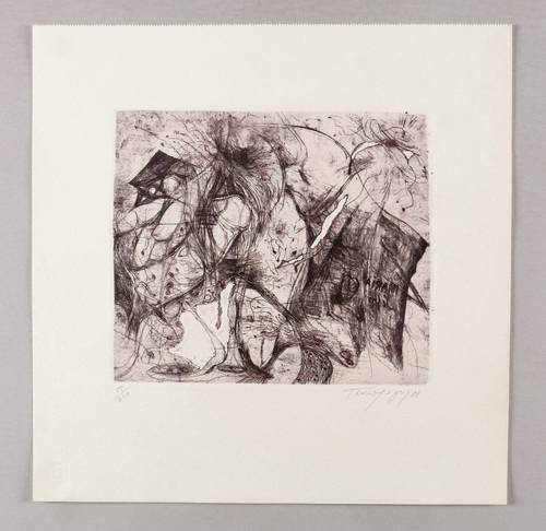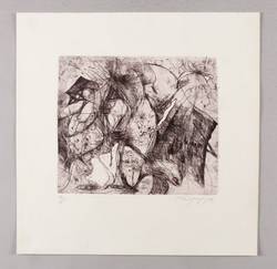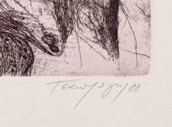 1988. Radierung / Strichätzung, Vernis mou, Roulette & Prägedruck, in Schwarzbraun, auf gehämmertem hellchamois Velin. – Originale Künstlergrafik, von Fotis Zaprasis. – Auflage Exemplar Nr. 88/200. – 20,7 x 24,2 cm (Darstellung / Platte), 36 x 36 cm (Blatt).