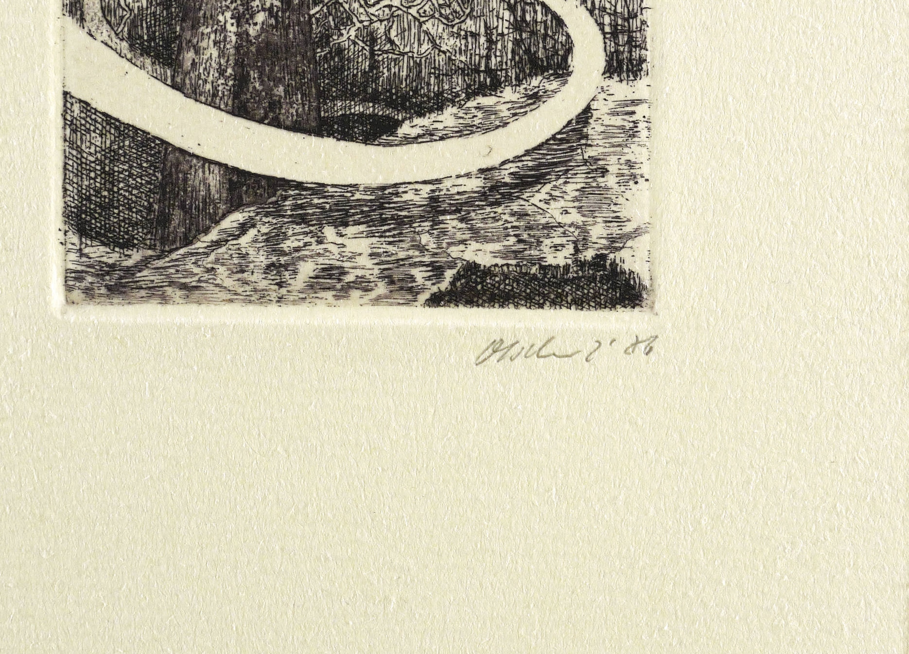 1986. Radierung / Strichätzung, in Schwarzviolett, auf hellgelbem Velinkarton. – Originale Künstlergrafik, von Detlef Olschewski. – 7,9 x 5,8 cm (Darstellung / Platte), 16 x 12 cm (Blatt).