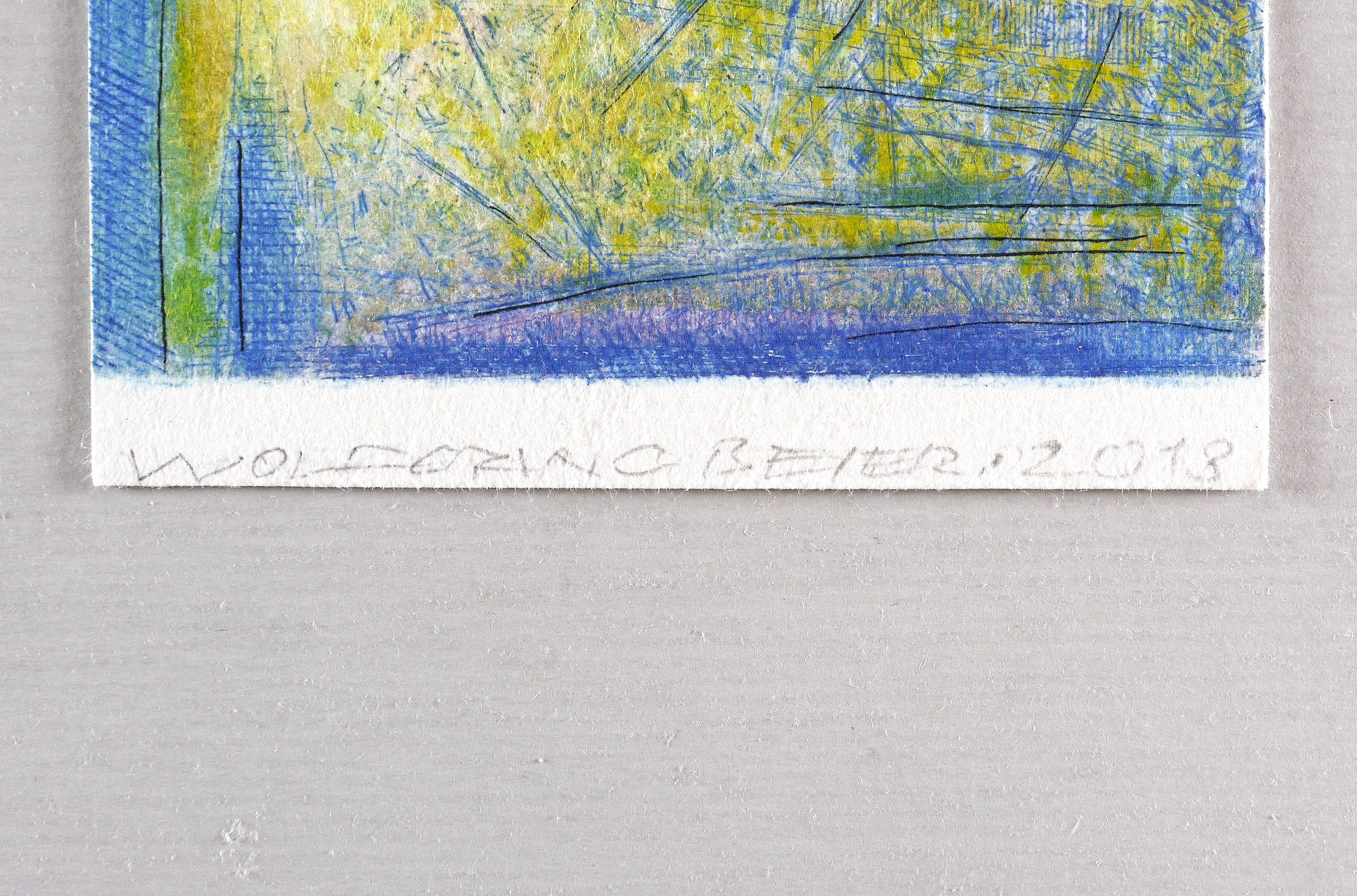 2013. Farbradierung / Strichätzung, in Gelb, Grün, Blau & Violett, auf hellchamois Velin. – Originale Künstlergrafik, von Wolfgang Beier. – 11,0 x 10,3 cm (Darstellung / Platte), 12,9 x 10,3 cm (Blatt).