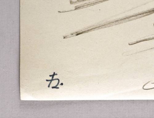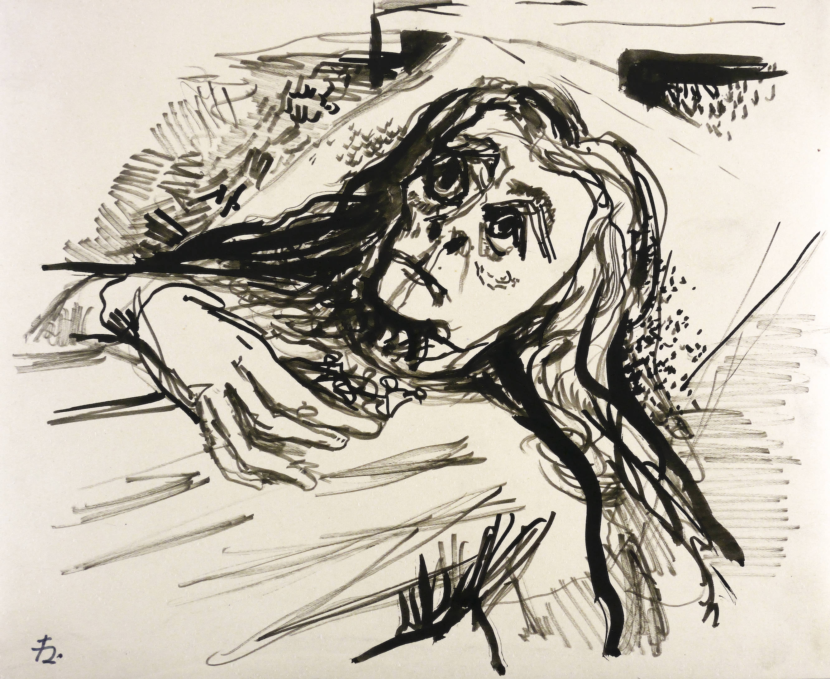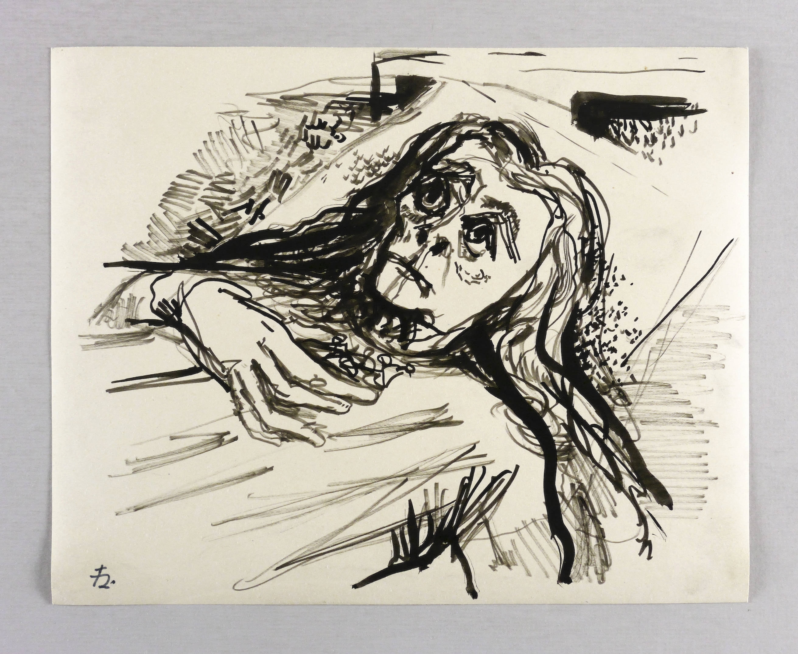 1955. Zeichnung / Pinselzeichnung, in schwarzer Tusche, auf gelblichem Fotokarton. – Originale Künstlergrafik, von Joachim Heuer. – Unikat. – 23,9 x 29,7 cm (Darstellung / Blatt).