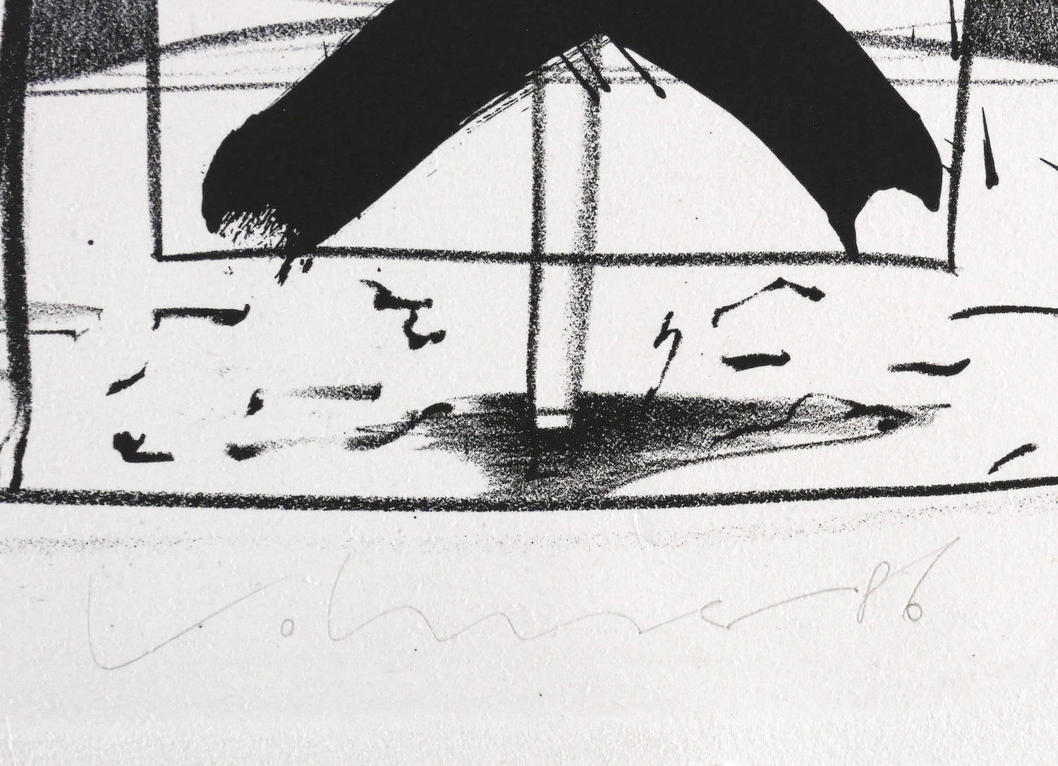 1986. Lithografie / Kreide- & Pinsellithografie, in Schwarz, auf schwerem hellchamois Bütten. – Originale Künstlergrafik, von Steffen Volmer. – Auflage Exemplar Nr. 20/20. – 34,0 x 44,9 cm (Darstellung / Druckbild), 38 x 50 cm (Blatt).