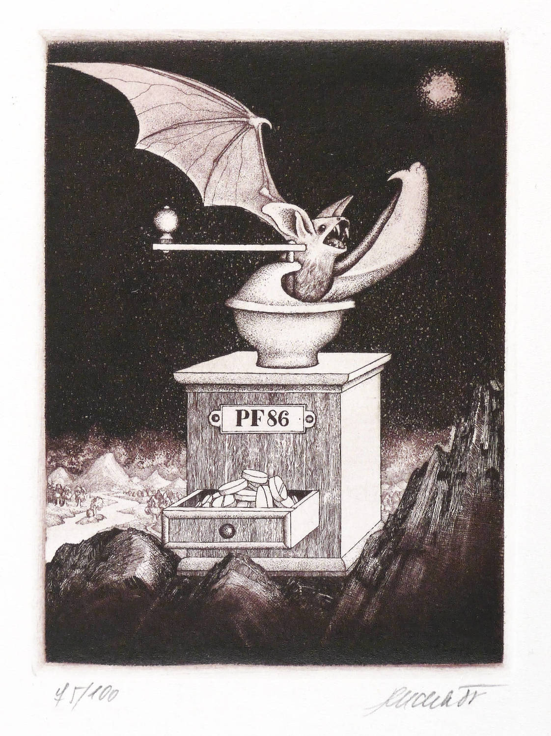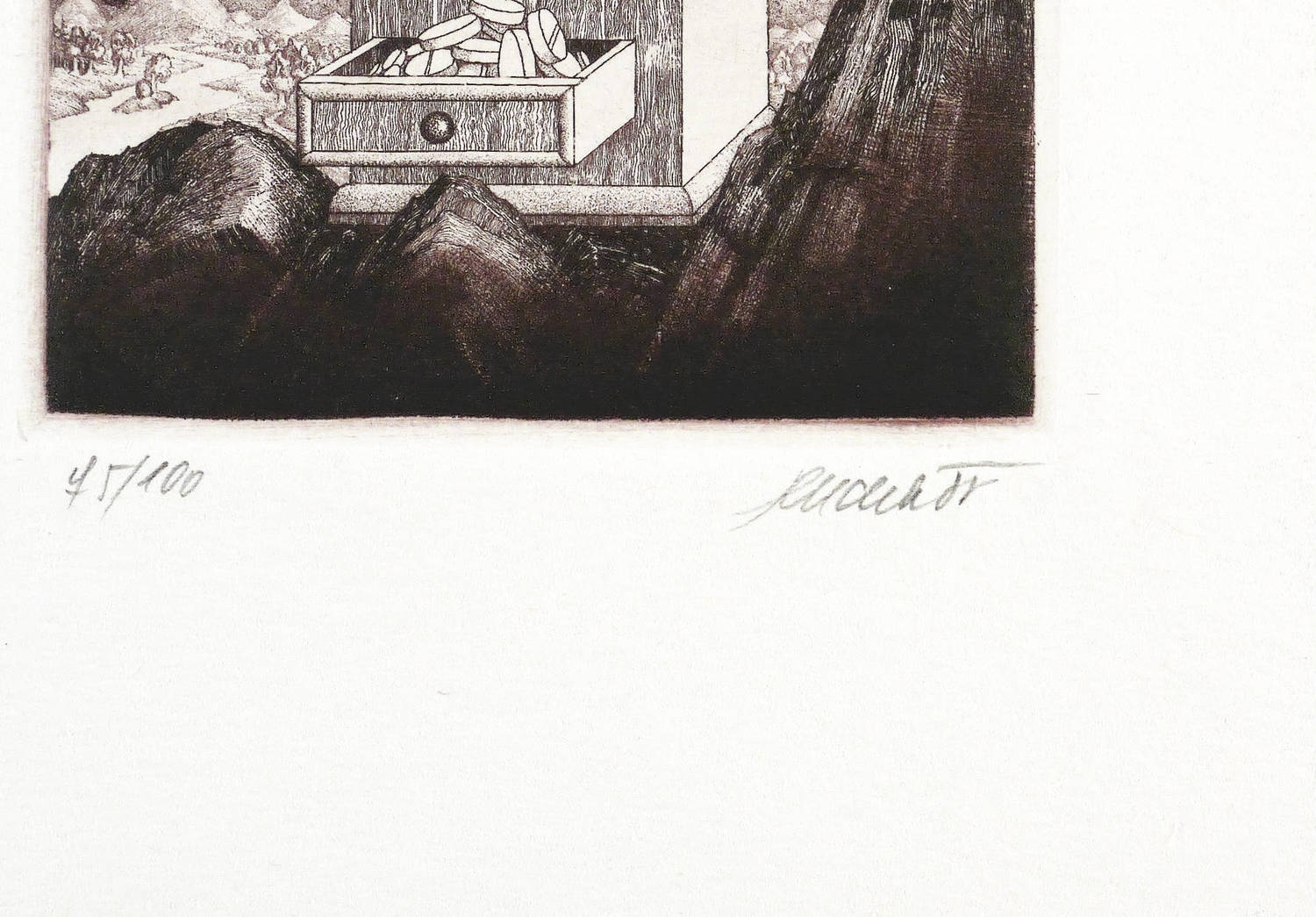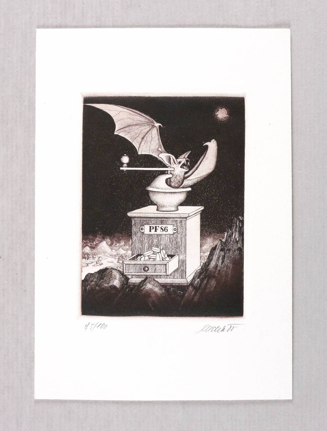 1985. Radierung / Aquatinta & Strichätzung, in Schwarzviolett, auf hartem weißem Velin. – Originale Künstlergrafik, von Josef Dudek. – Auflage Exemplar Nr. 75/100. – 8,6 x 6,5 cm (Darstellung / Platte), 14,6 x 10,0 cm (Blatt).