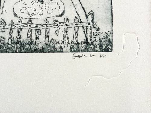 1975. Radierung / Strichätzung & Aquatinta, mit Plattenton, in Schwarzgrün, auf hellchamois Hahnemühle. – Originale Künstlergrafik, von Günther Kressl. – Auflage Exemplar Nr. 3/30. – 11,6 x 10,8 cm (Darstellung / Platte), 20 x 18 cm (Blatt).