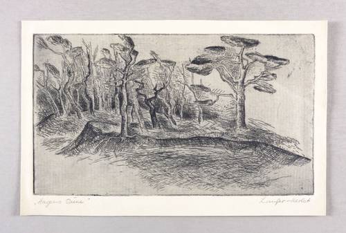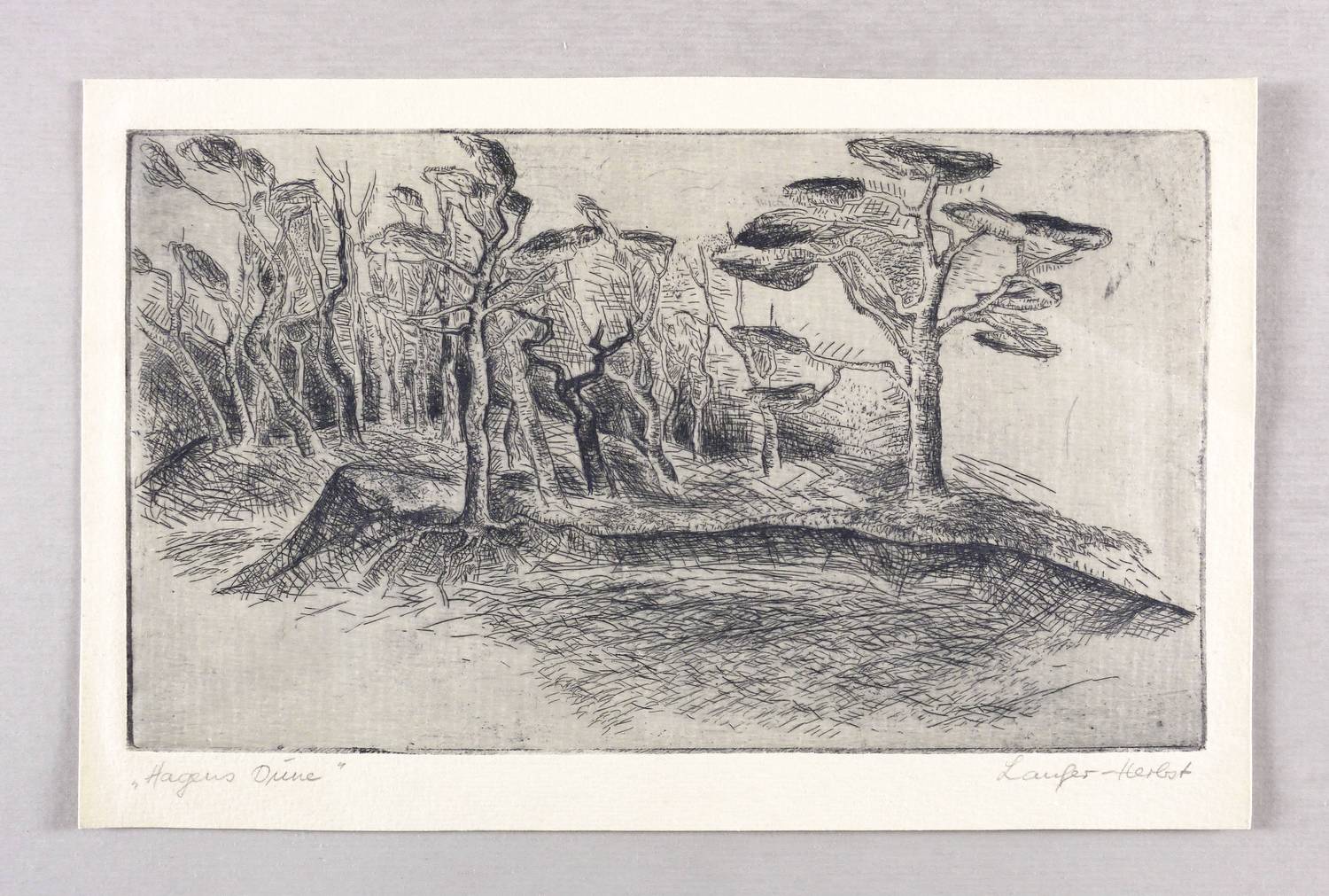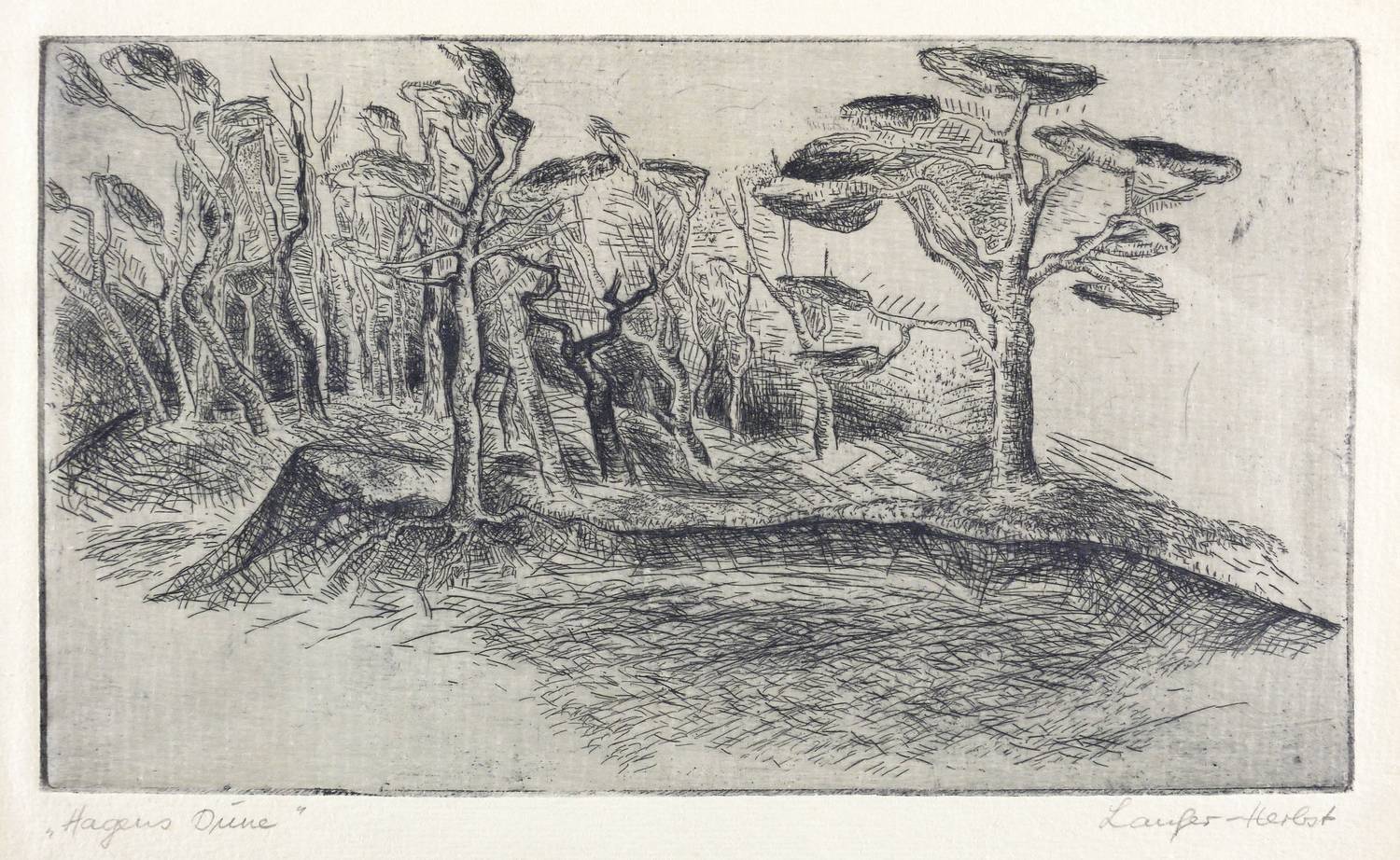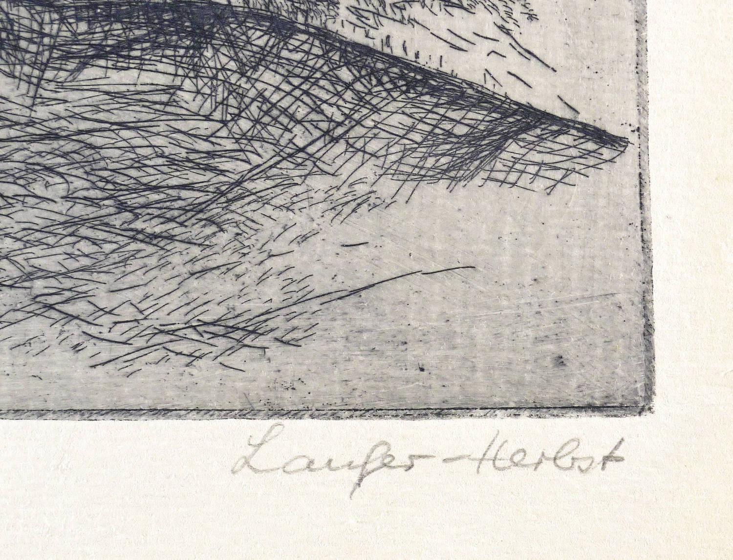 Um 1970. Radierung / Strichätzung, in Schwarz, auf hellchamois Weißenborn. – Originale Künstlergrafik, von Maria Laufer-Herbst. – 15,7 x 27,3 cm (Darstellung / Platte), 19 x 30 cm (Blatt).