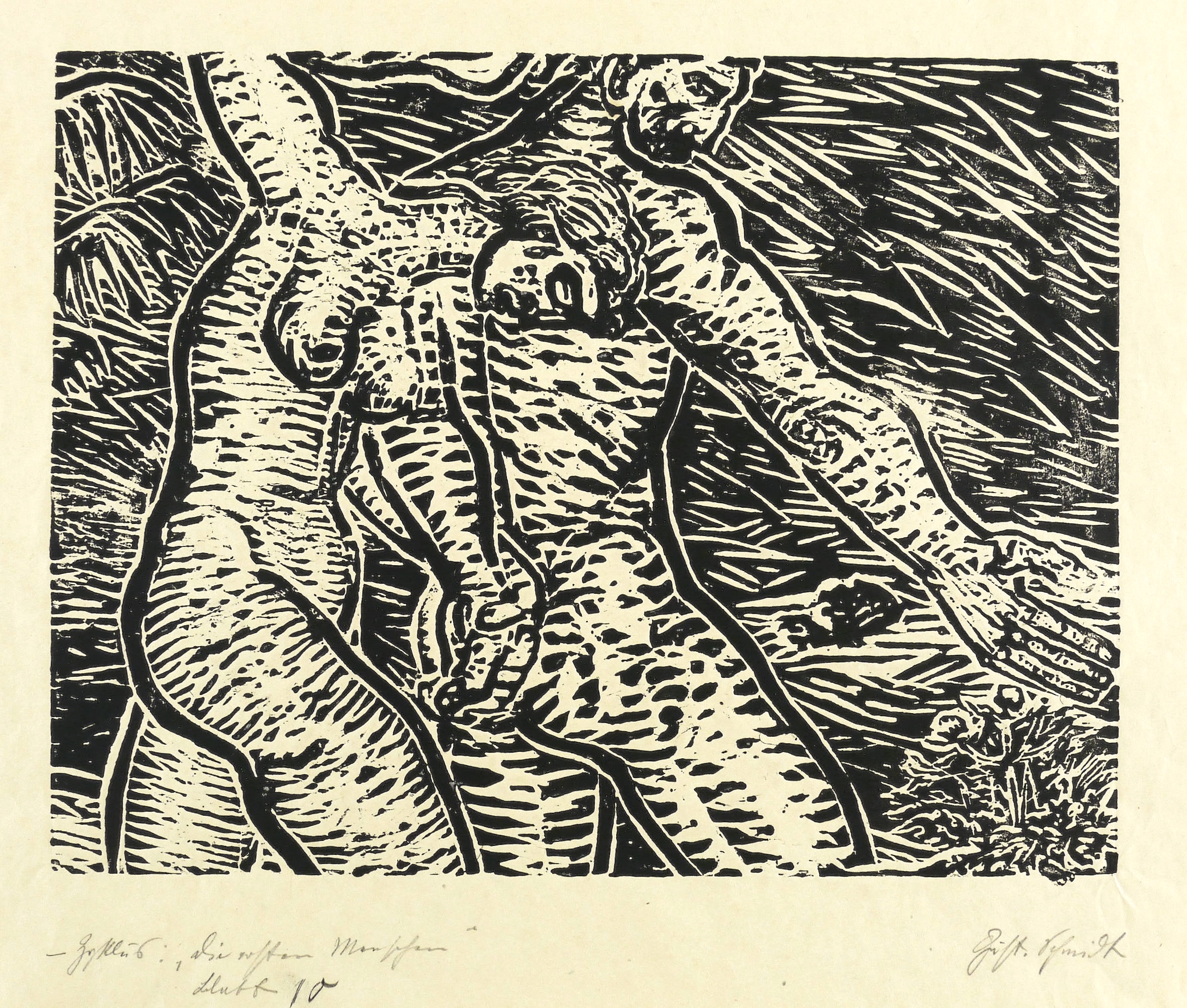 Rechts unten in Bleistift signiert: ″Gust. Schmidt″. Im unteren Blattrand links betitelt und bezeichnet: ″Zyklus: 'Die ersten Menschen' / Blatt 10″. – Sehr guter Zustand.