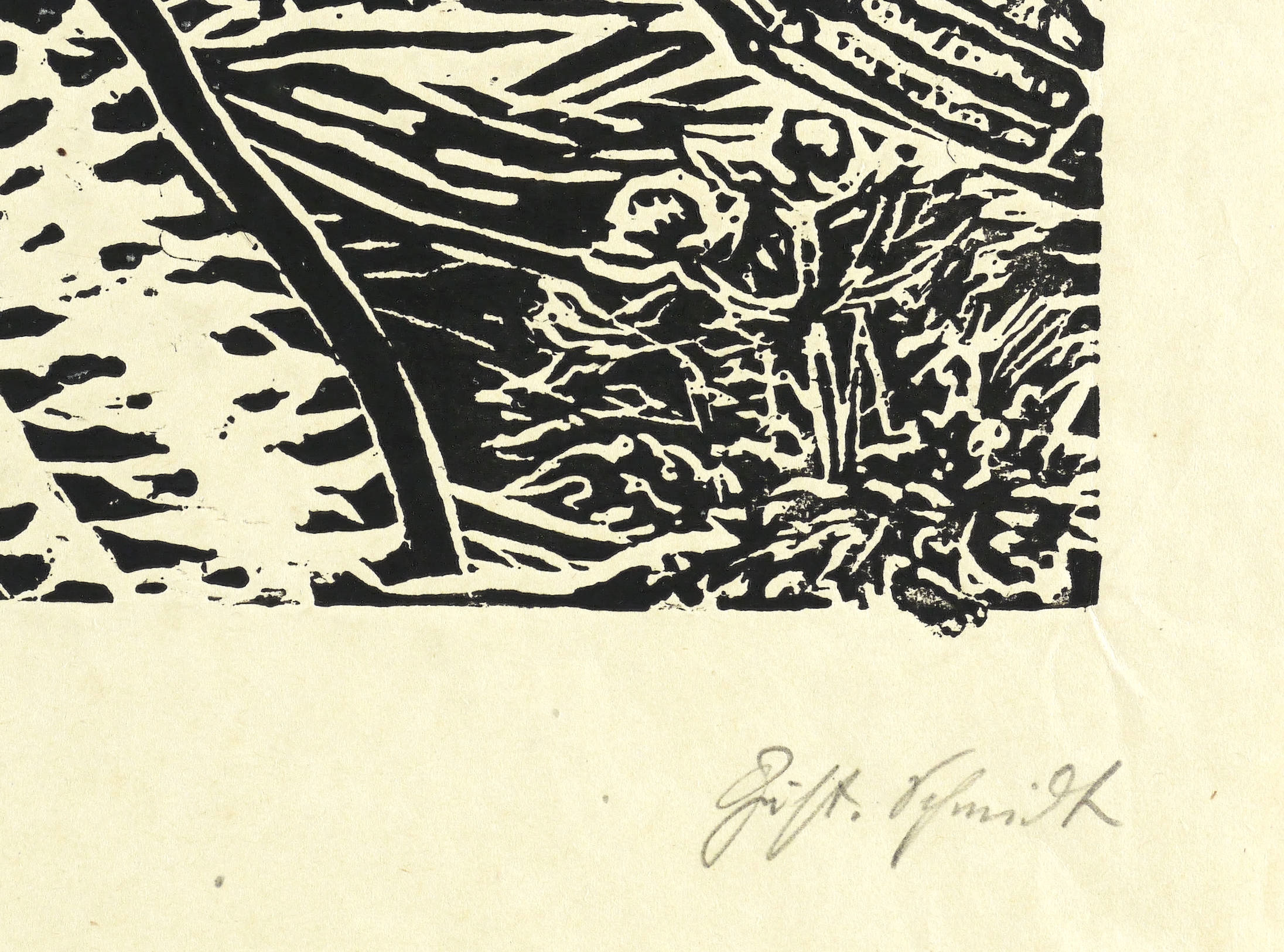 1927. Holzschnitt, in Schwarz, auf hartem gelbem Velin. – Originale Künstlergrafik, von Gustav Schmidt. – 24,5 x 31,7 cm (Darstellung / Druckstock), 31 x 37 cm (Blatt).
