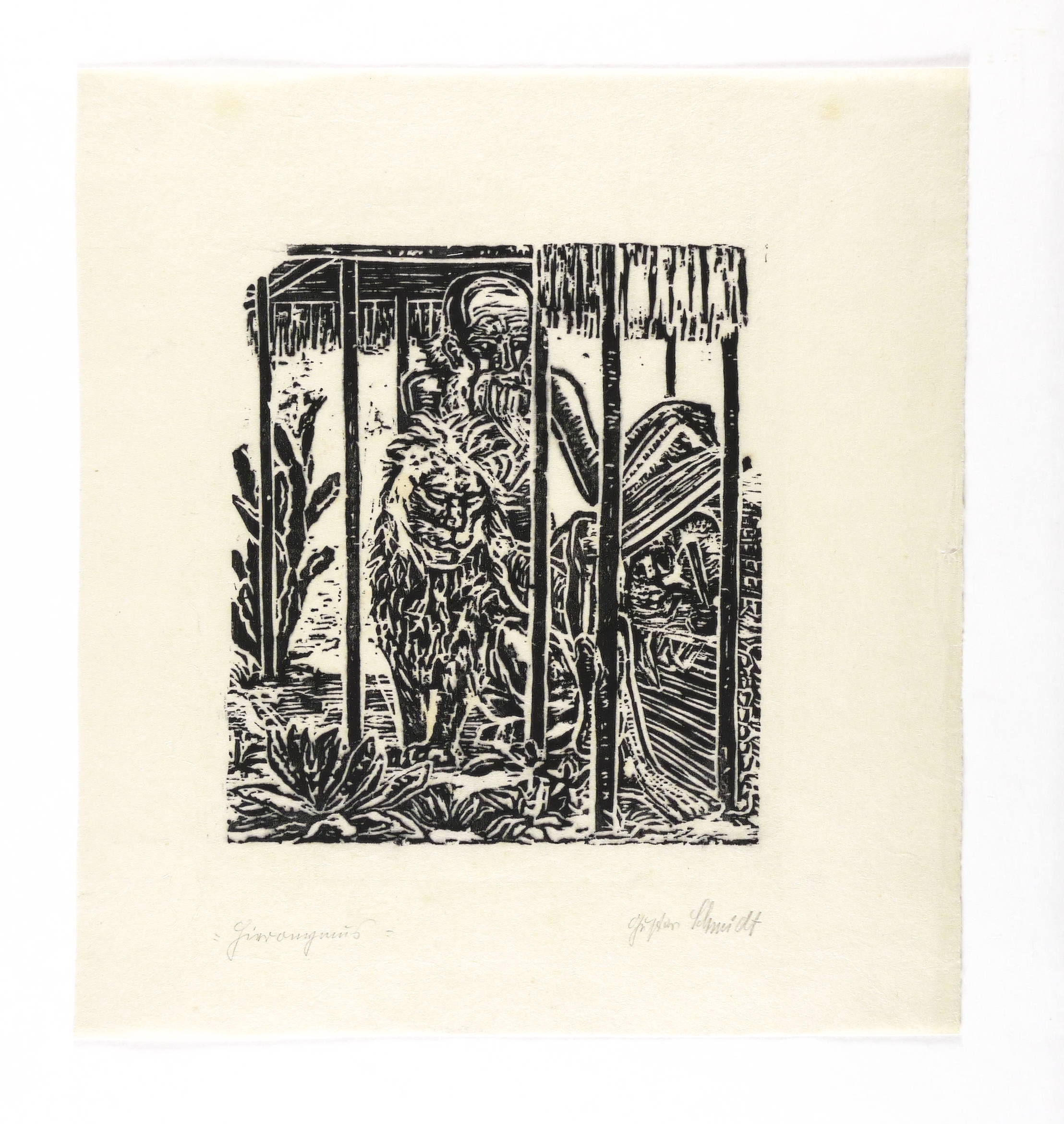 1920. Holzschnitt, in Schwarz, auf gelblichem Japanbütten. – Originale Künstlergrafik, von Gustav Schmidt. – 24,5 x 21,8 cm (Darstellung / Druckstock), 40 x 36 cm (Blatt).