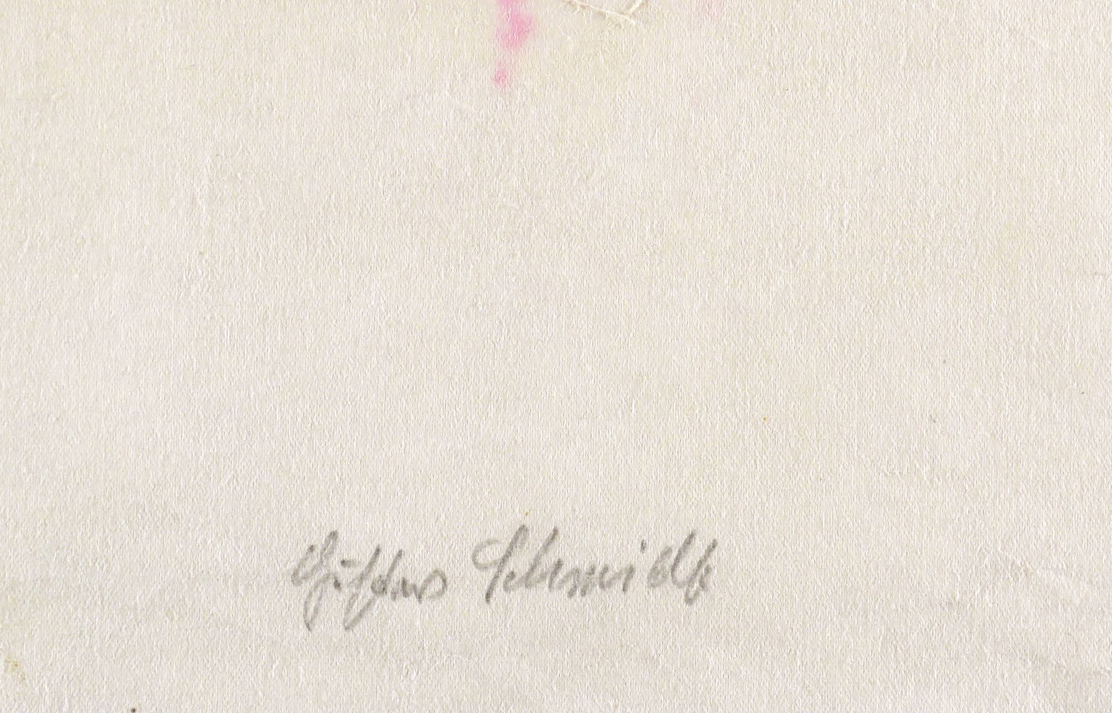 Rechts unten in Bleistift signiert: ″Gustav Schmidt″. Links betitelt: ″Hlg. Familie in Trümmerstätte″. Im Holzstock rechts unten Monogramm und Jahr: ″GS 21″. – Der breite Rand mit leichten Flecken und Griffspuren. Insgesamt mäßig guter Zustand.