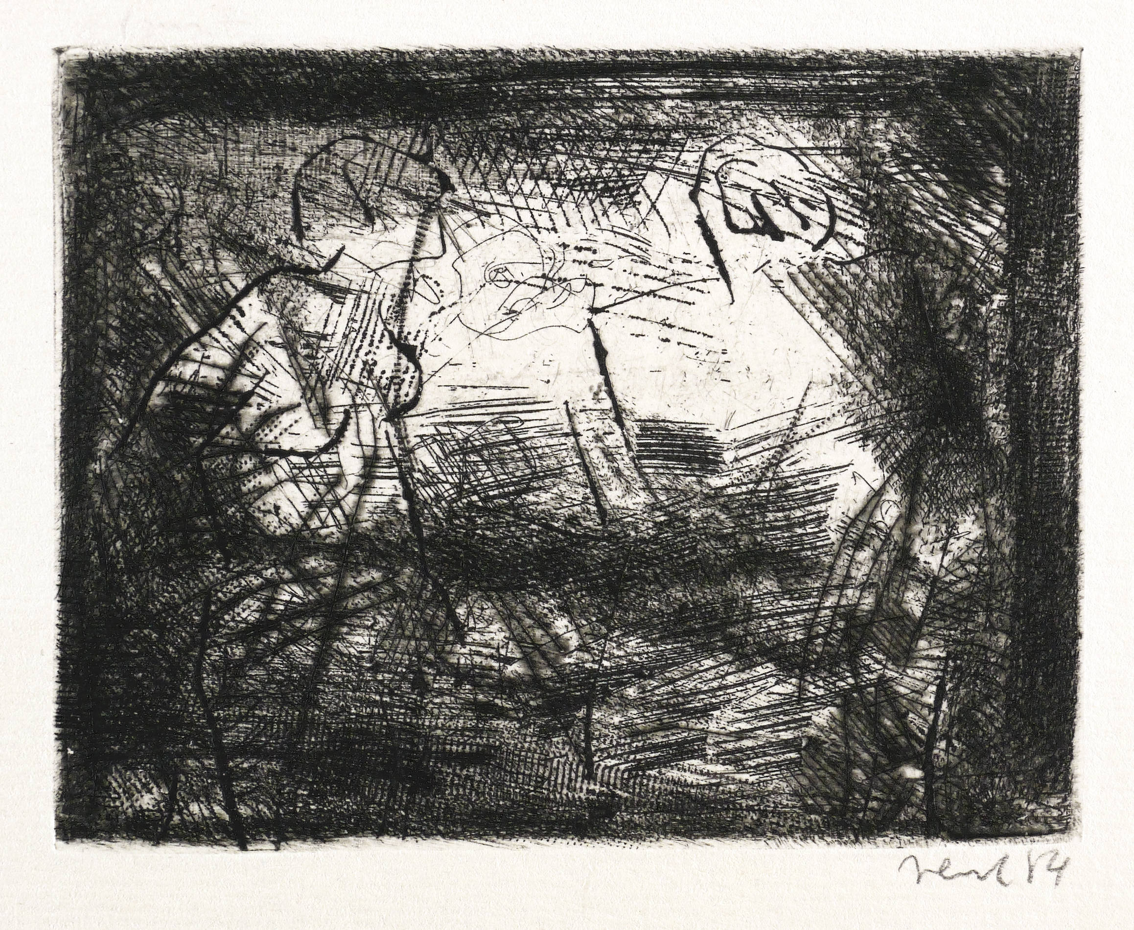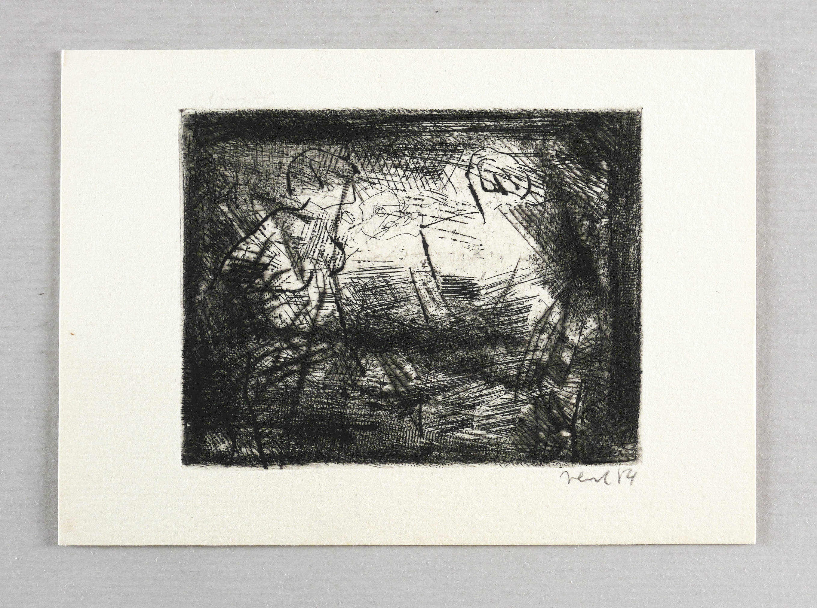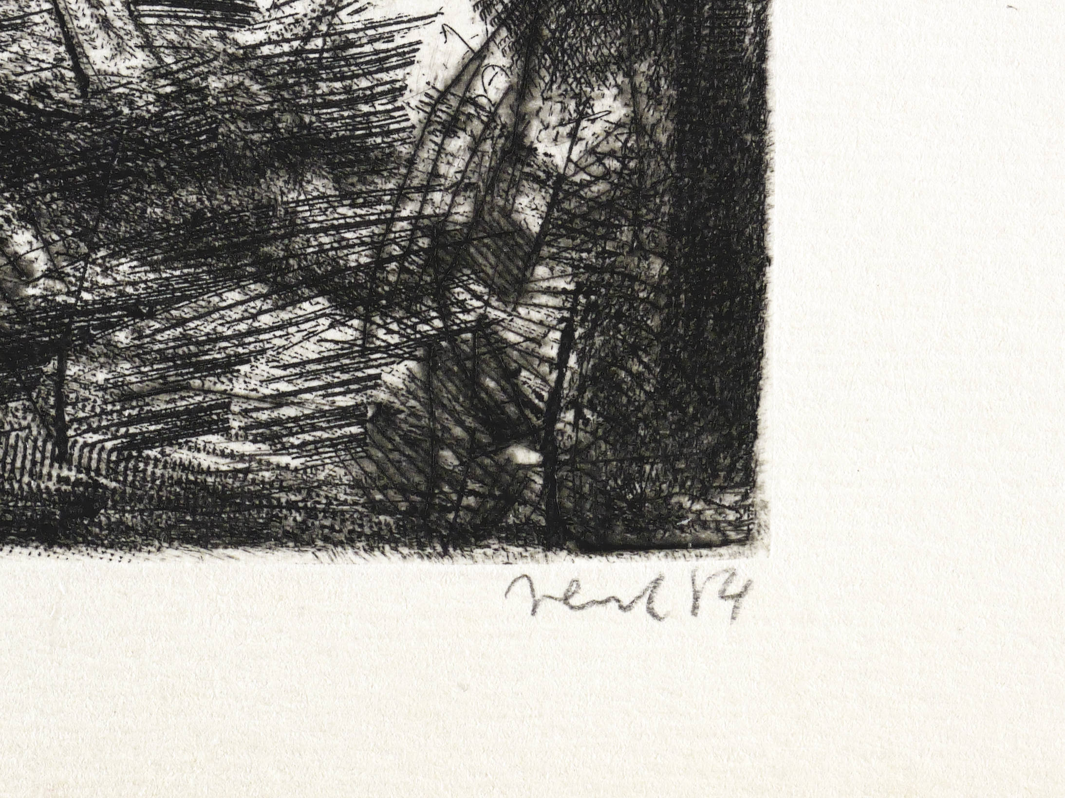 1984. Radierung / Roulette, Strichätzung & Kaltnadel, in Schwarz, auf hellchamois Weißenborn. – Originale Künstlergrafik, von Hans Vent. – 7,8 x 9,8 cm (Darstellung / Platte), 11 x 15 cm (Blatt).