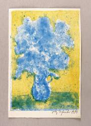 1974. Farblithografie / Pinsellithografie, in Gelb & Blau, auf gelblichem Velin. – Originale Künstlergrafik, von Elly Schreiter. – 19,8 x 13,6 cm (Darstellung / Druckbild), 22 x 15 cm (Blatt).