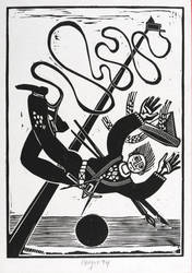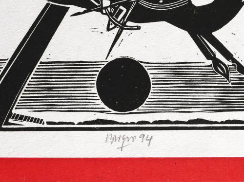 1994. Linolschnitt, in Schwarz, auf hellrotem Maschinenpapier. – Originale Künstlergrafik, von Roland R. Berger. – 17,7 x 12,7 cm (Darstellung / Druckbild), 20 x 14 cm (Blatt).