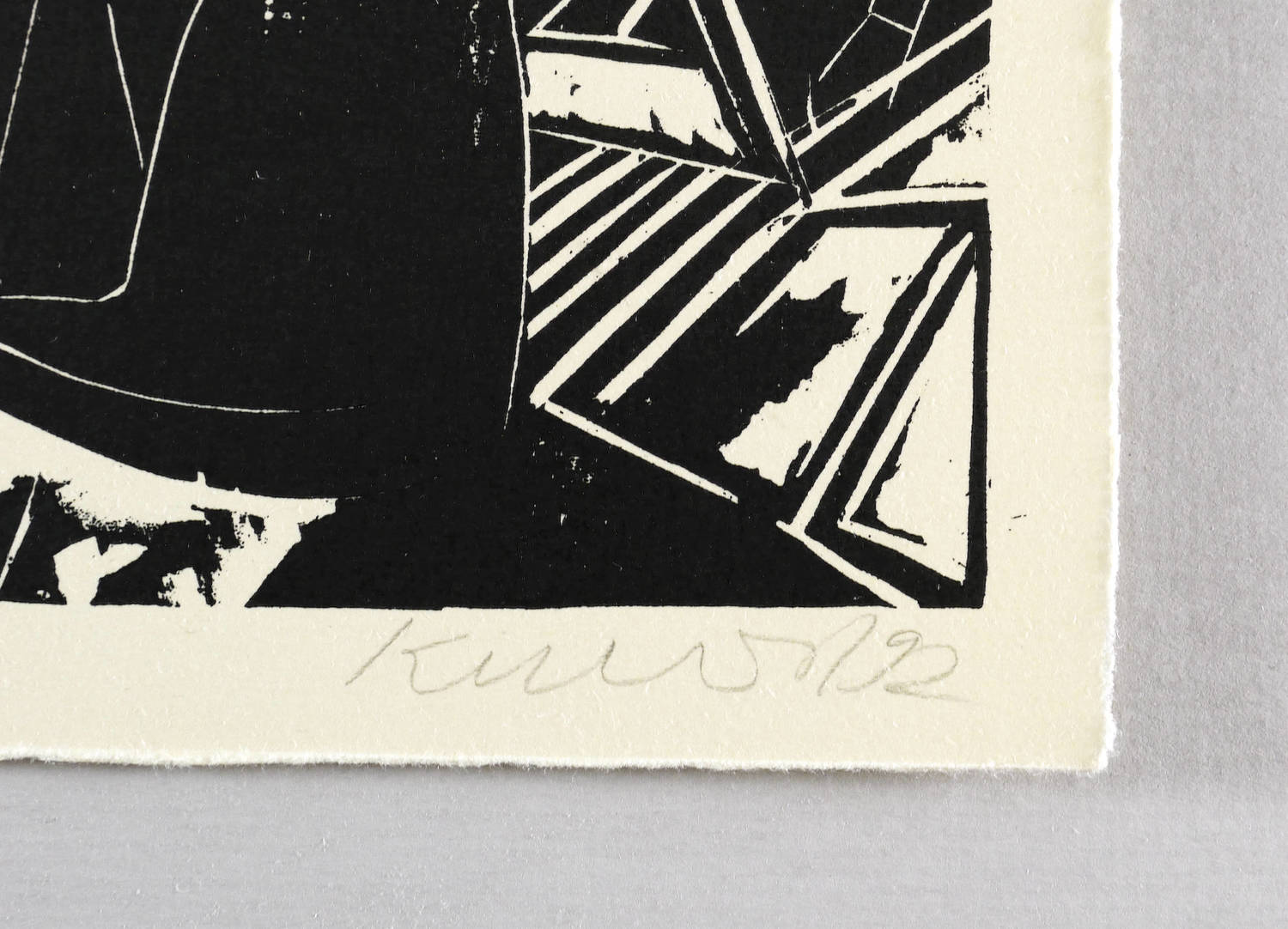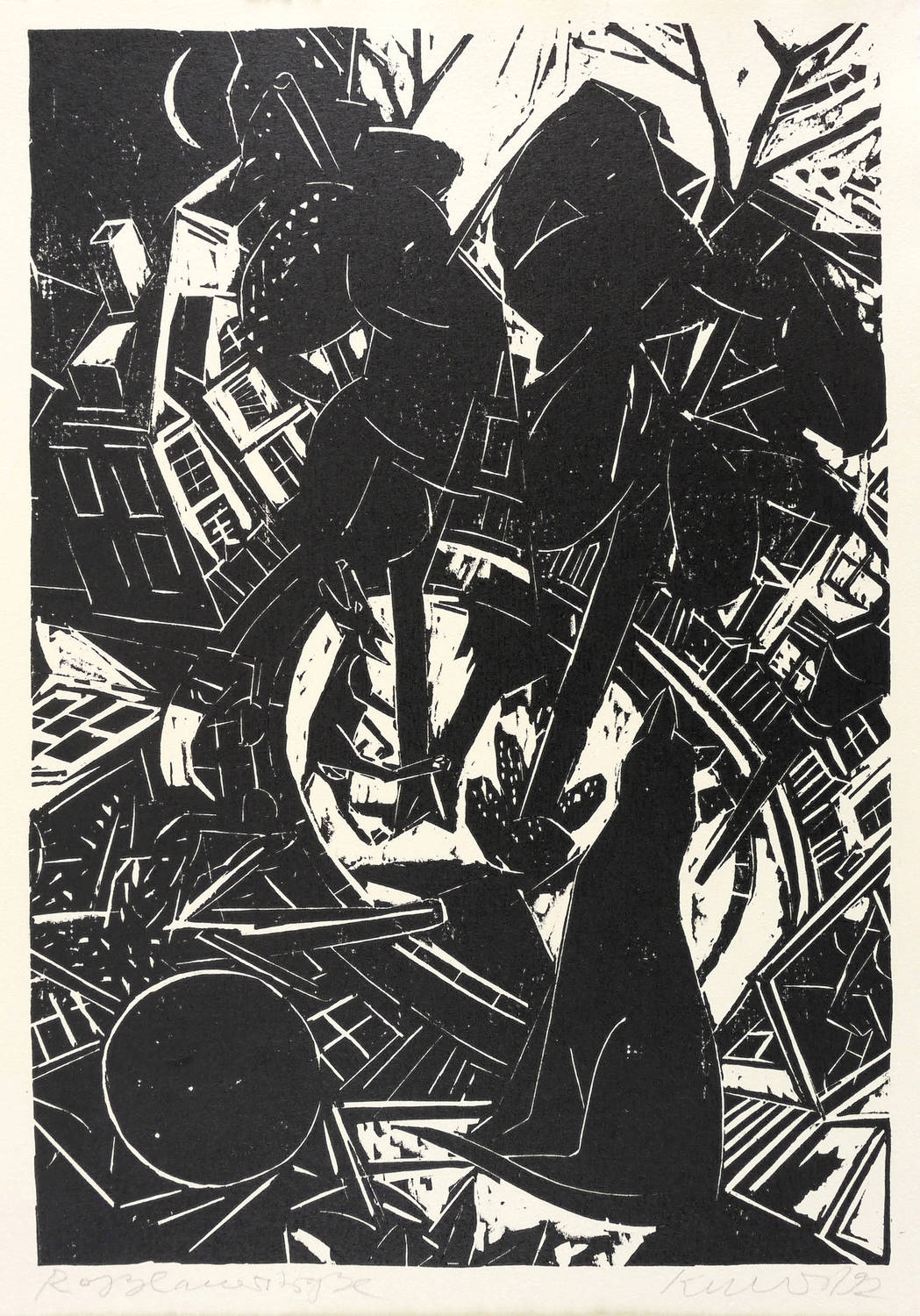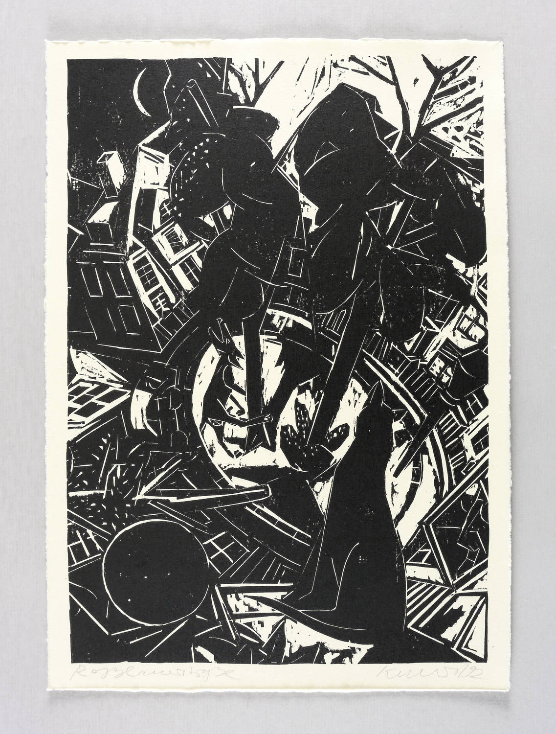 1992. Holzschnitt, in Schwarz, auf hellgelbem Velinkarton. – Originale Künstlergrafik, von Rolf Kuhrt. – Auflage 150 Exemplare. – 31,8 x 21,9 cm (Darstellung / Druckstock), 34 x 25 cm (Blatt).