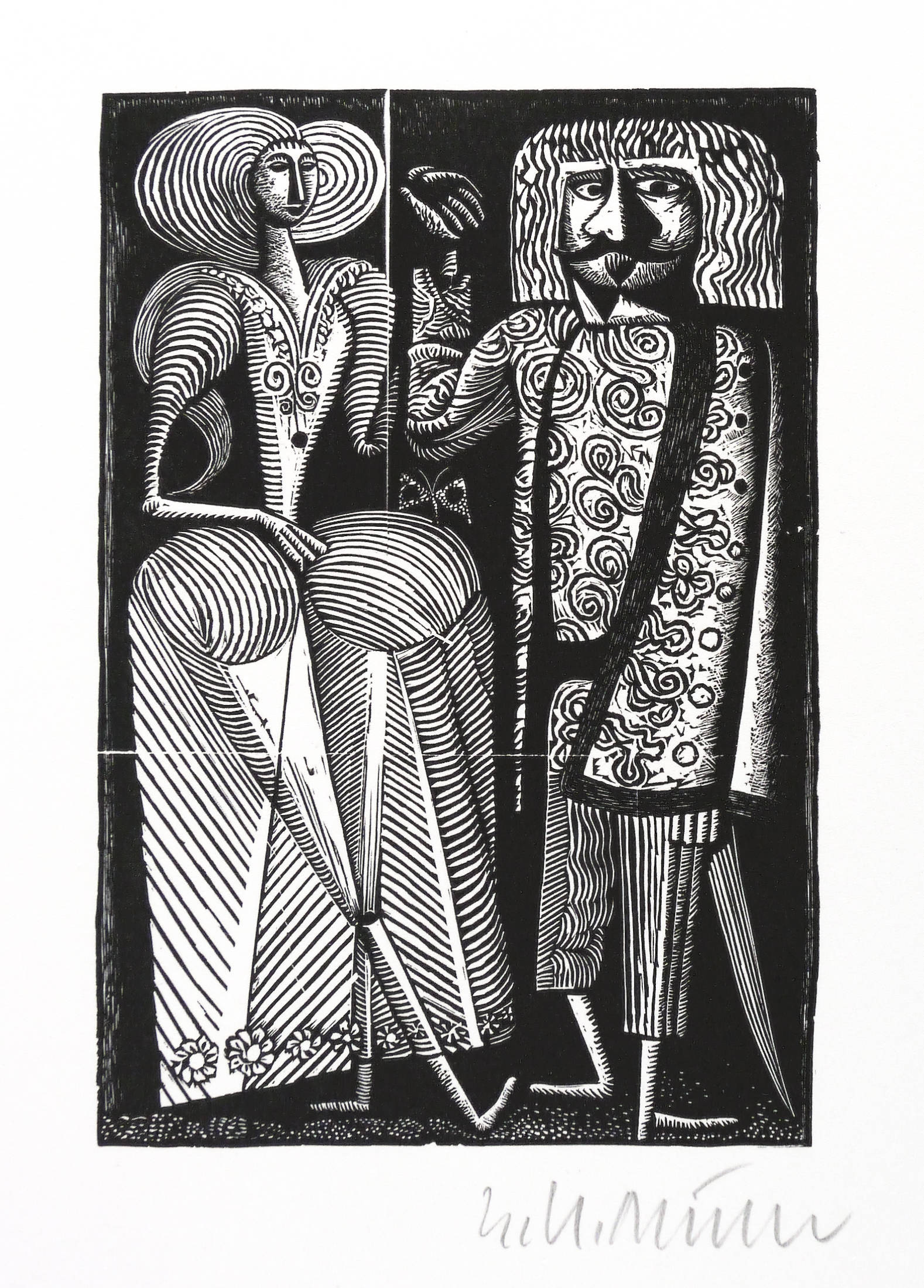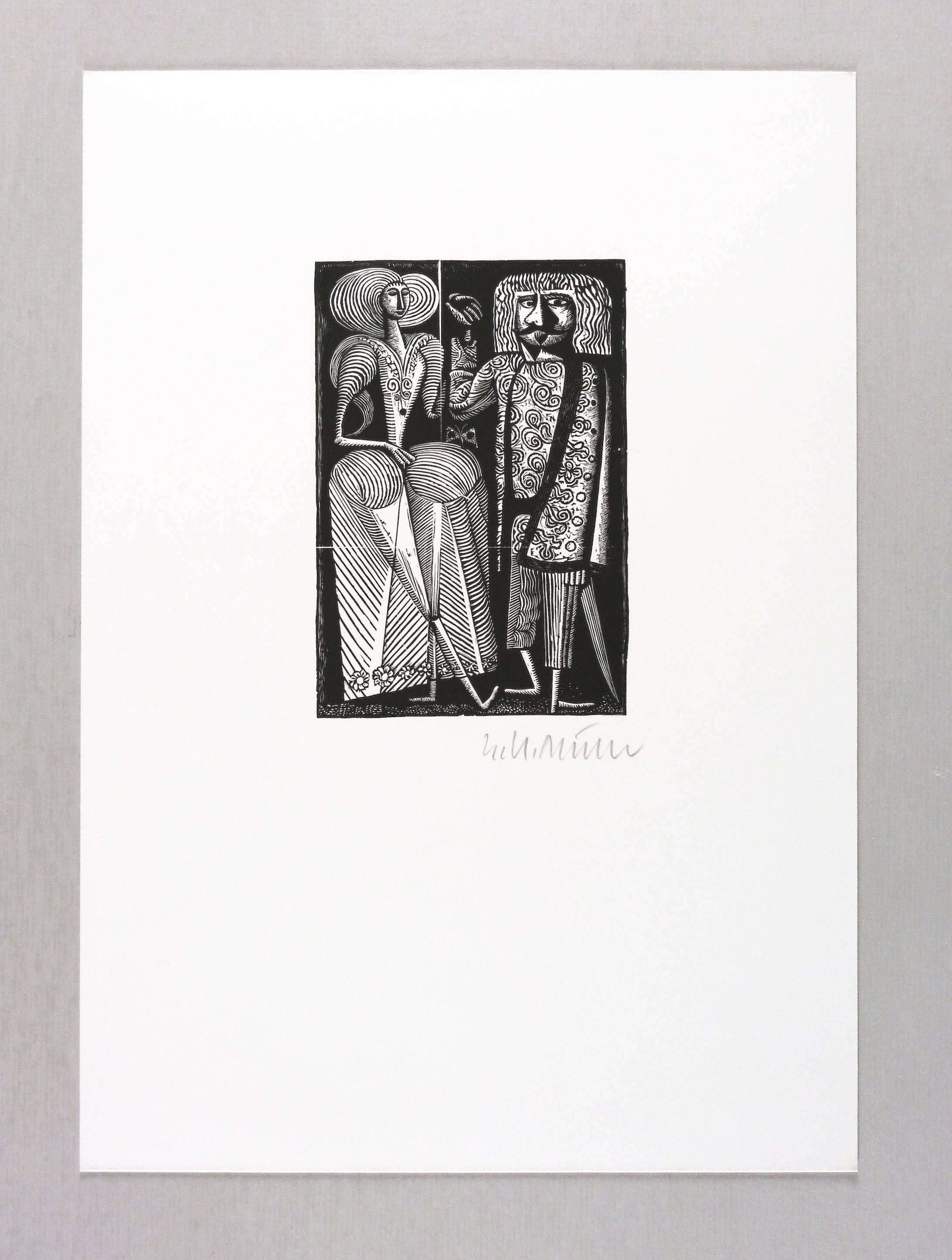 Gerhard Kurt Müller (*1926 Leipzig-Probstheida, lebt in Leipzig). Deutscher Maler, Grafiker und Bildhauer. 1941-43 Lehre im Grafischen Gewerbe, Besuch der Gutenbergschule, dort erste künstlerische Anregungen.Mitglied des Leipziger Kunstvereins. 1948 Bewerbung an der Hochschule für Grafik und Buchkunst Leipzig. Zum Wintersemester 1948/49 Immatrikulation. Bis 1952 Studium an der HGB Leipzig bei Elisabeth Voigt und C.K. Massloff. Abschluss mit Diplom mit satirischen Lithographien und einer Arbeit über Honoré Daumier. 1952 Mitglied des Verbandes Bildender Künstler Deutschlands, später VBK/DDR. 1954-68 Lehrtätigkeit und Professur (1961) an der HGB Leipzig, Leiter der Abteilung für Freie Grafik, Leiter der Klasse für Freie Grafik und Illustration. 1964-66 Rektor der HGB Leipzig. Ab 1968 freischaffend in Leipzig. 1954 erste Holzstiche, Illustrationen zu Gogol, Balzac, Heine, Kleist, Schiller u.a.. 1966 erstes größeres Tafelbild, ab 1973 Holzskulpturen.