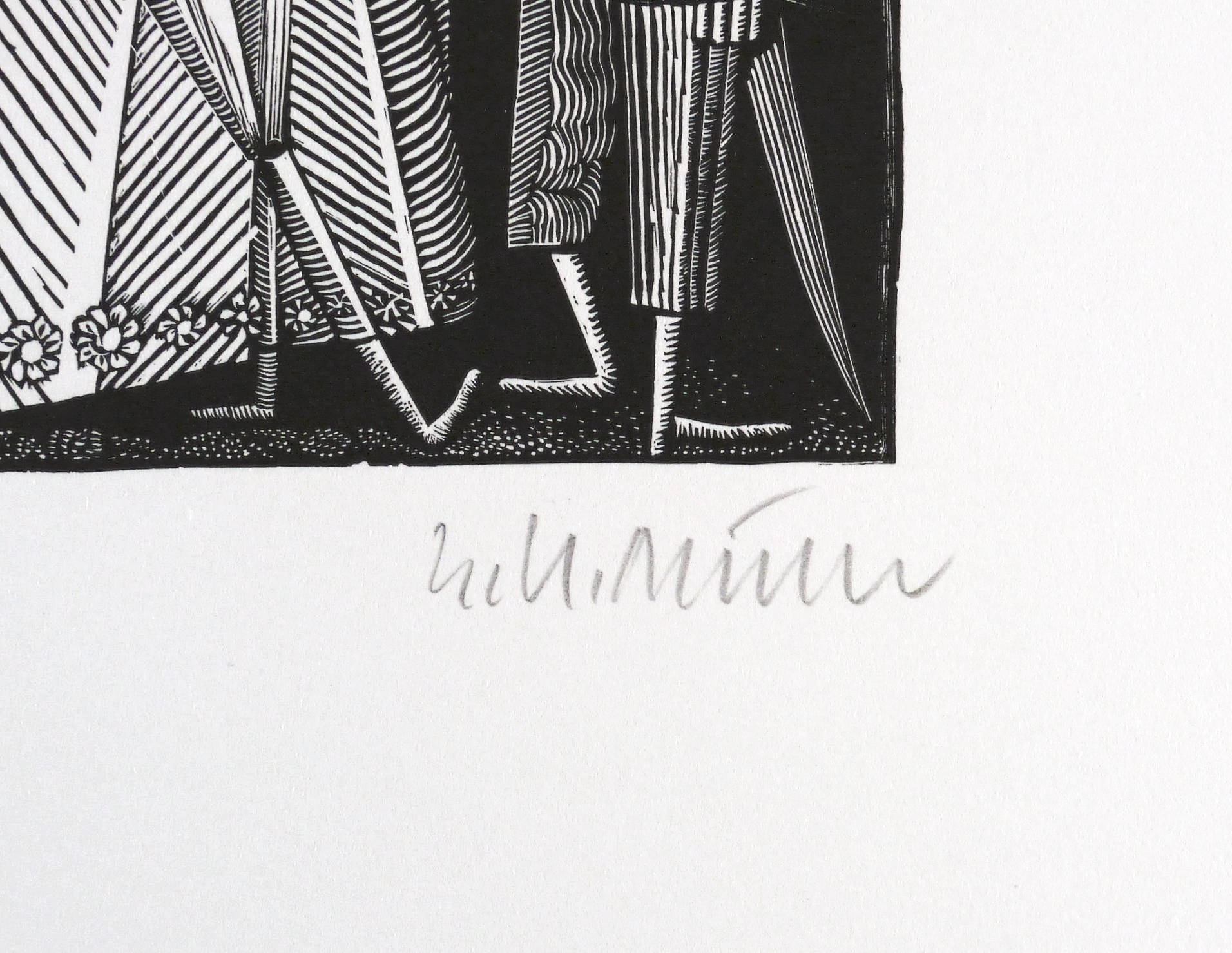 1992. Holzschnitt, in Schwarz, auf glattem weißem Velinkarton. – Originale Künstlergrafik, von Gerhard Kurt Müller. – Auflage Exemplar Nr. XCV/CXX. – 14,2 x 9,7 cm (Darstellung / Druckstock), 34 x 24 cm (Blatt).