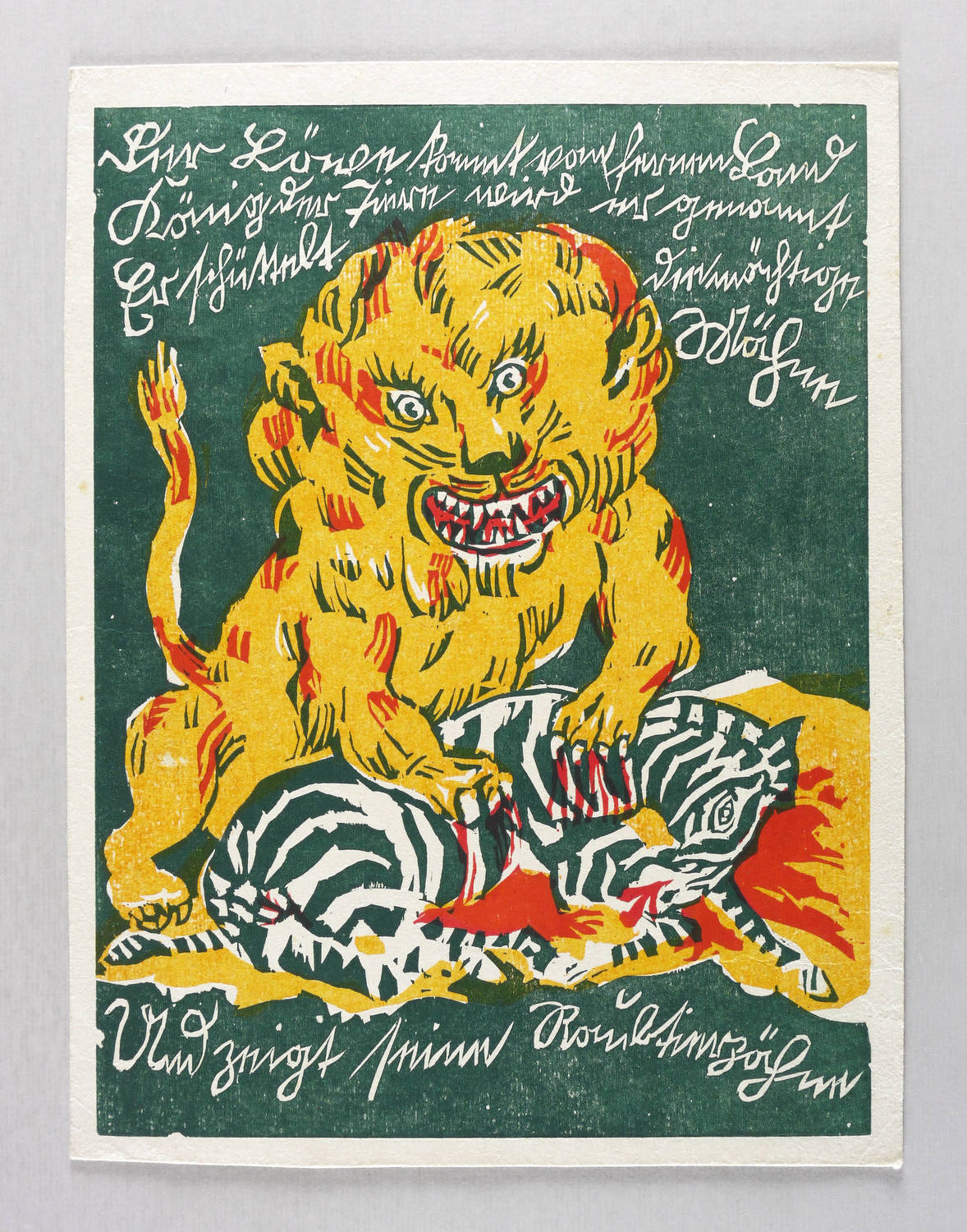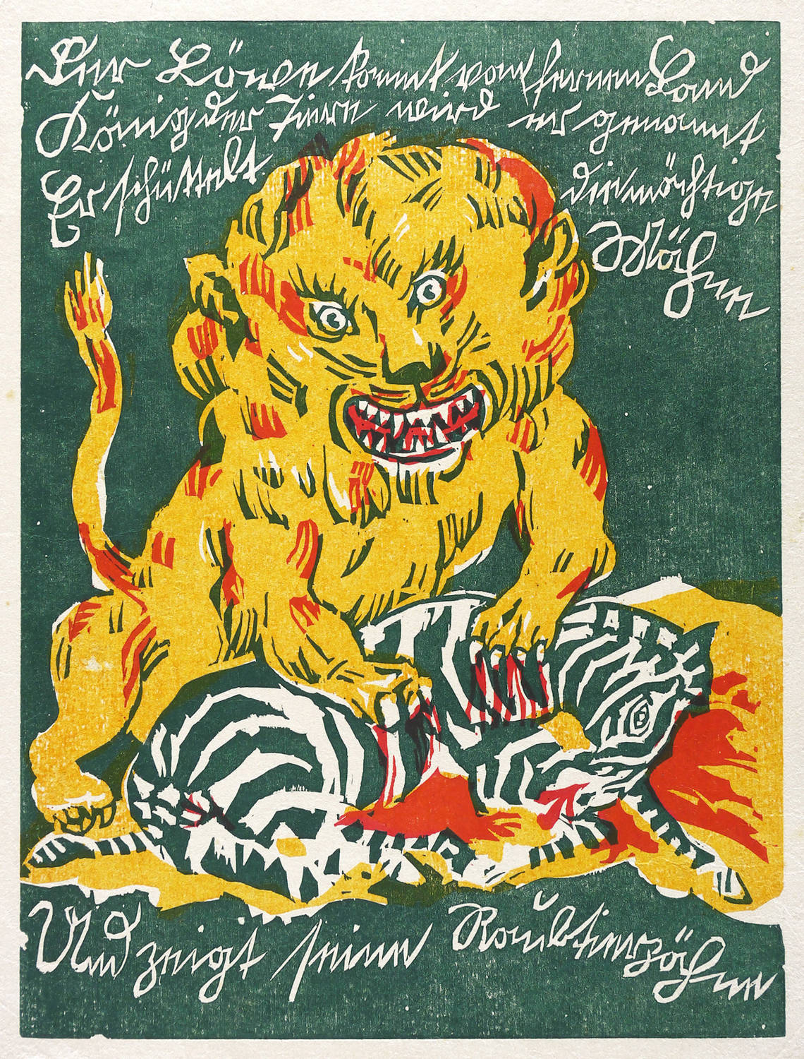 Seebaß II, 1835. Lang 310. – Aus: Otto Schubert, Bilderbuch für Tyll und Nele. 27. Druck für die Marées-Gesellschaft (München: Piper 1920). – Nicht handsigniert. Im Druckstock weiß auf farbigem Grund die Inschrift: ″Der Löwe kommt von fernem Land / König der Tiere wird er genannt / Er schüttelt die mächtige Mähne / Und zeigt seine Raubtierzähne″. – Originaler Farbholzschnitt aus dem bekannten Kinderbuch des deutschen Expressionismus ″Bilderbuch für Tyll und Nele″ von 1920. Druck von vier Stöcken unter Aufsicht des Künstlers auf der Handpresse bei Jakob Hegner, Dresden-Hellerau. - Adolf Seebaß urteilte: ″Sehr interessantes, eigenartiges Bilderbuch, zweifellos eines der originellsten Kinderbücher des 20. Jahrhunderts.″ – Originalrandiges unbeschnittenes Exemplar. Blatt vor allem im Randbereich etwas knickspurig, die Ecken vereinzelt bestoßen. Insgesamt mäßig guter Zustand.