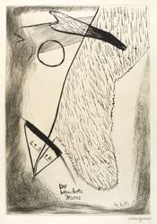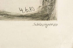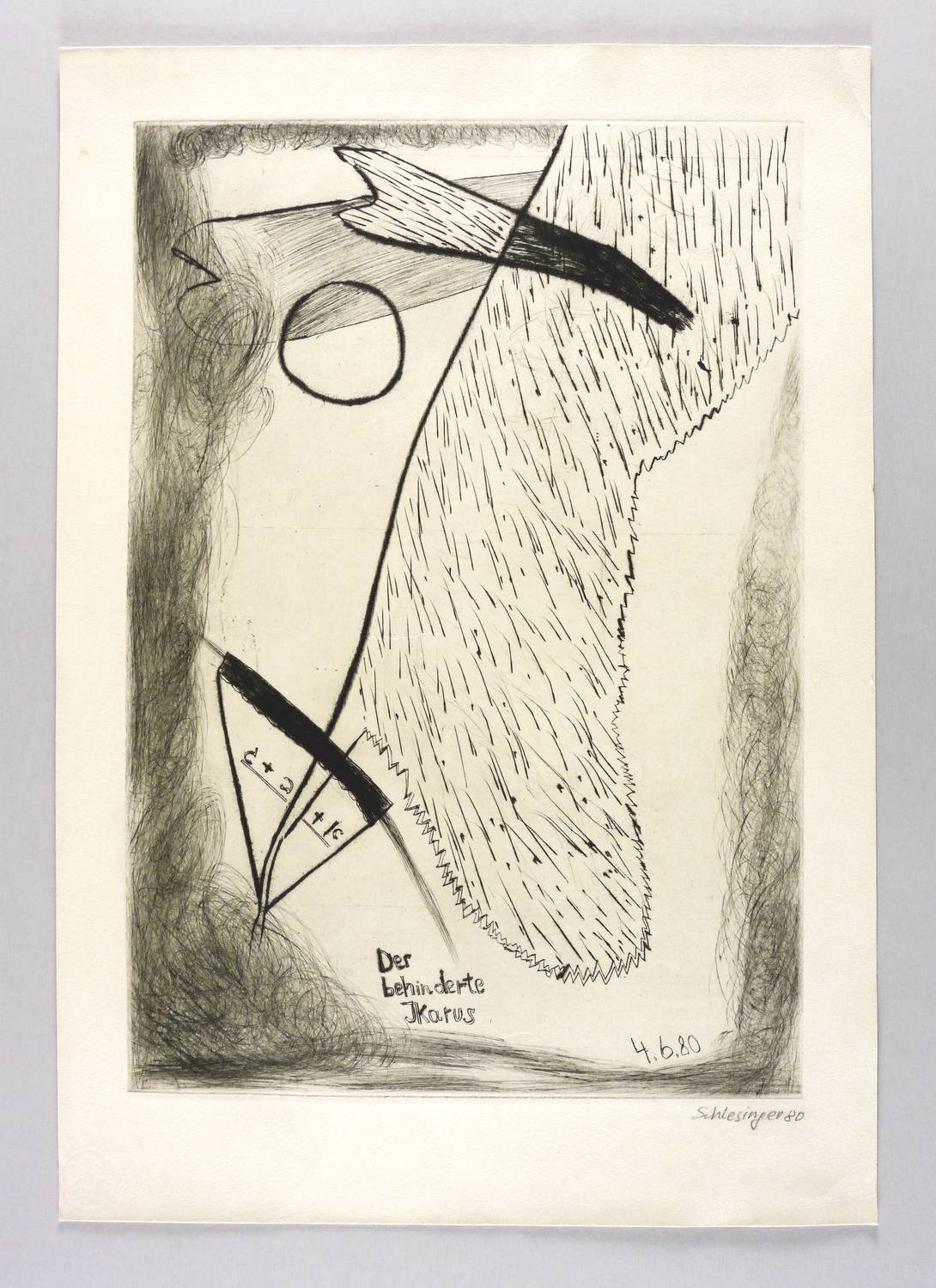 Rechts unten in Bleistift signiert und datiert: ″Schlesinger 1980″. In der Platte Inschrift: ″Der behinderte Ikarus // 4.6.80″. Wasserzeichen der Hahnemühle. – Blattecke rechts oben etwas bestoßen. Unscheinbares Fleckchen links oben im Rand. Mäßig guter Zustand.