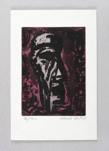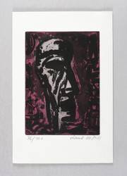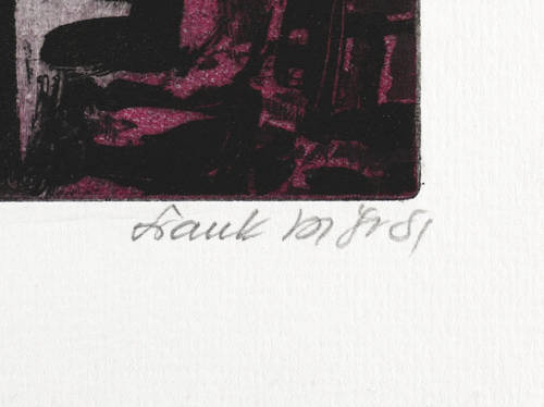1981. Farbradierung / Aquatinta, in Weinrot & Schwarz, auf festem hellchamois Weißenborn. – Originale Künstlergrafik, von Frank Voigt. – Auflage Exemplar Nr. 36/100. – 16,4 x 11,8 cm (Darstellung / Druckbild), 24 x 16 cm (Blatt).