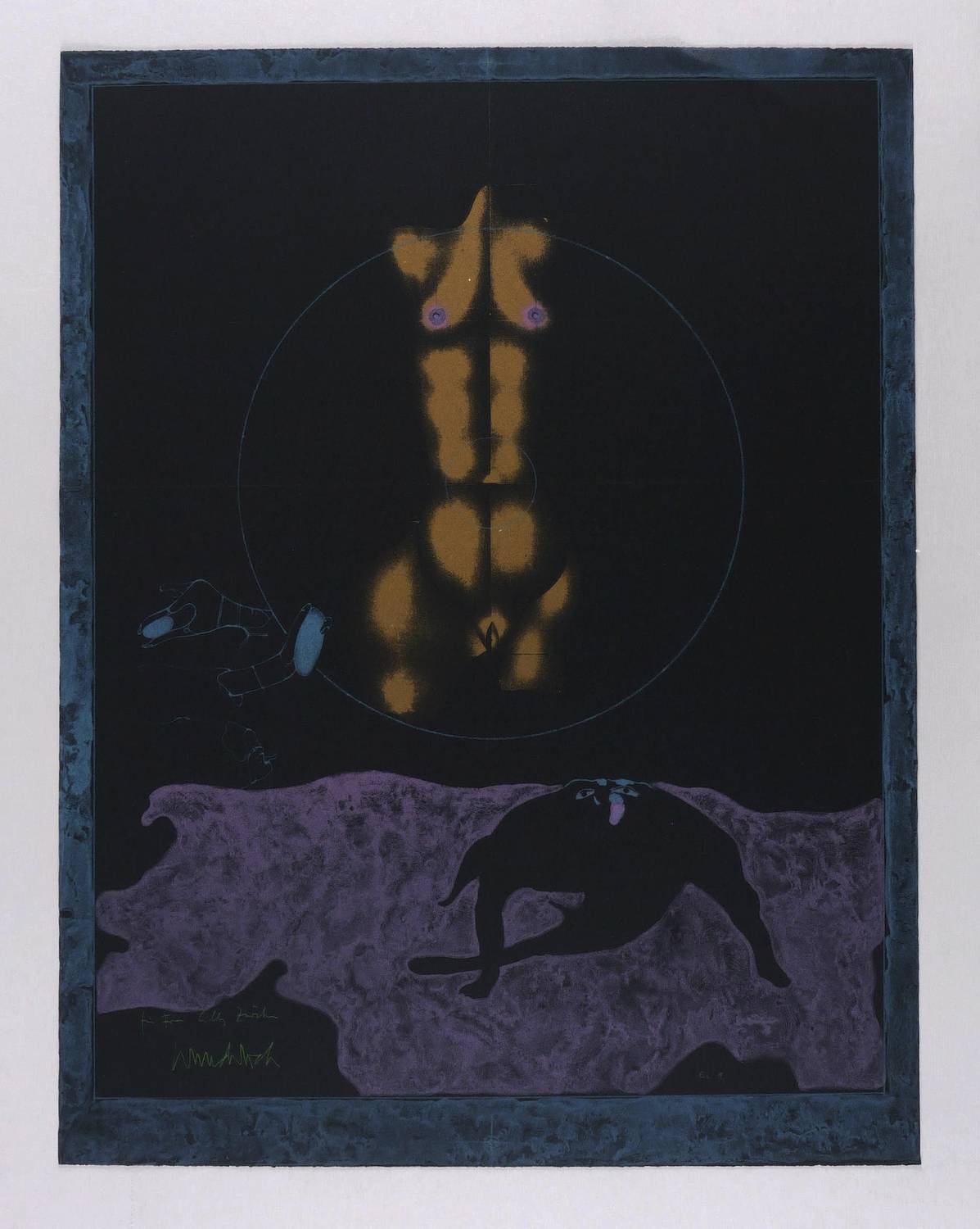 1971. Farblithografie / Kreide- & Pinsellithografie, in Gold, Weißblau & Violett, auf schwarzem Tonbütten. – Originale Künstlergrafik, von Paul Wunderlich. – Künstlerexemplar (e.a.). – 65,0 x 50,0 cm (Darstellung / Blatt).
