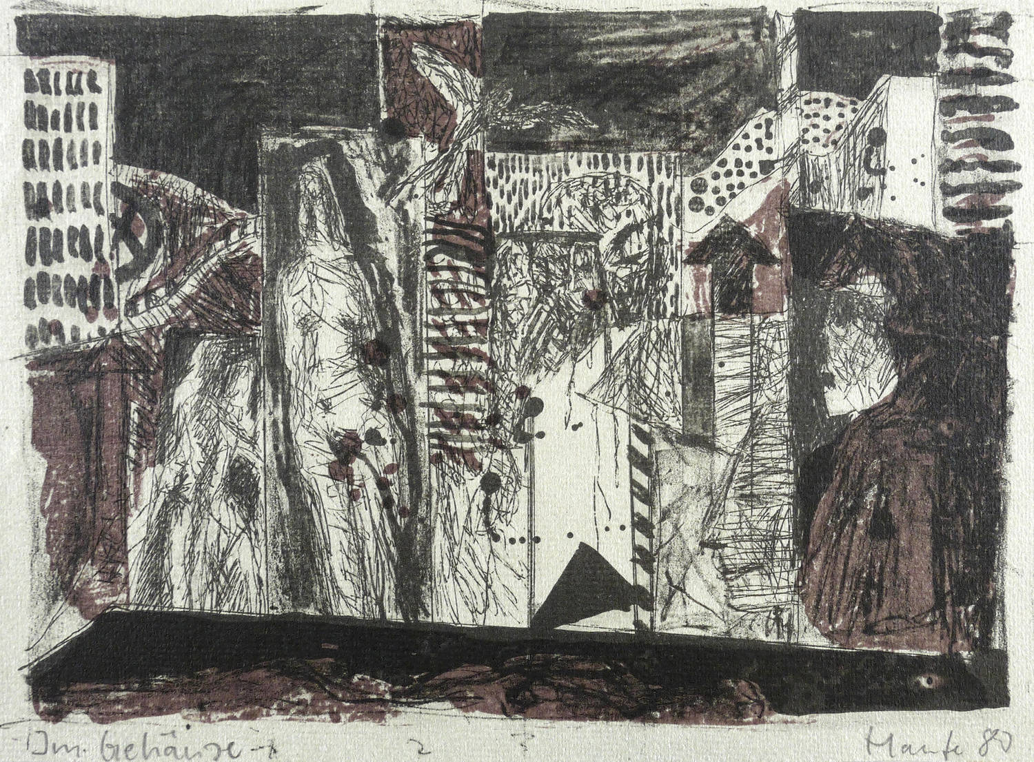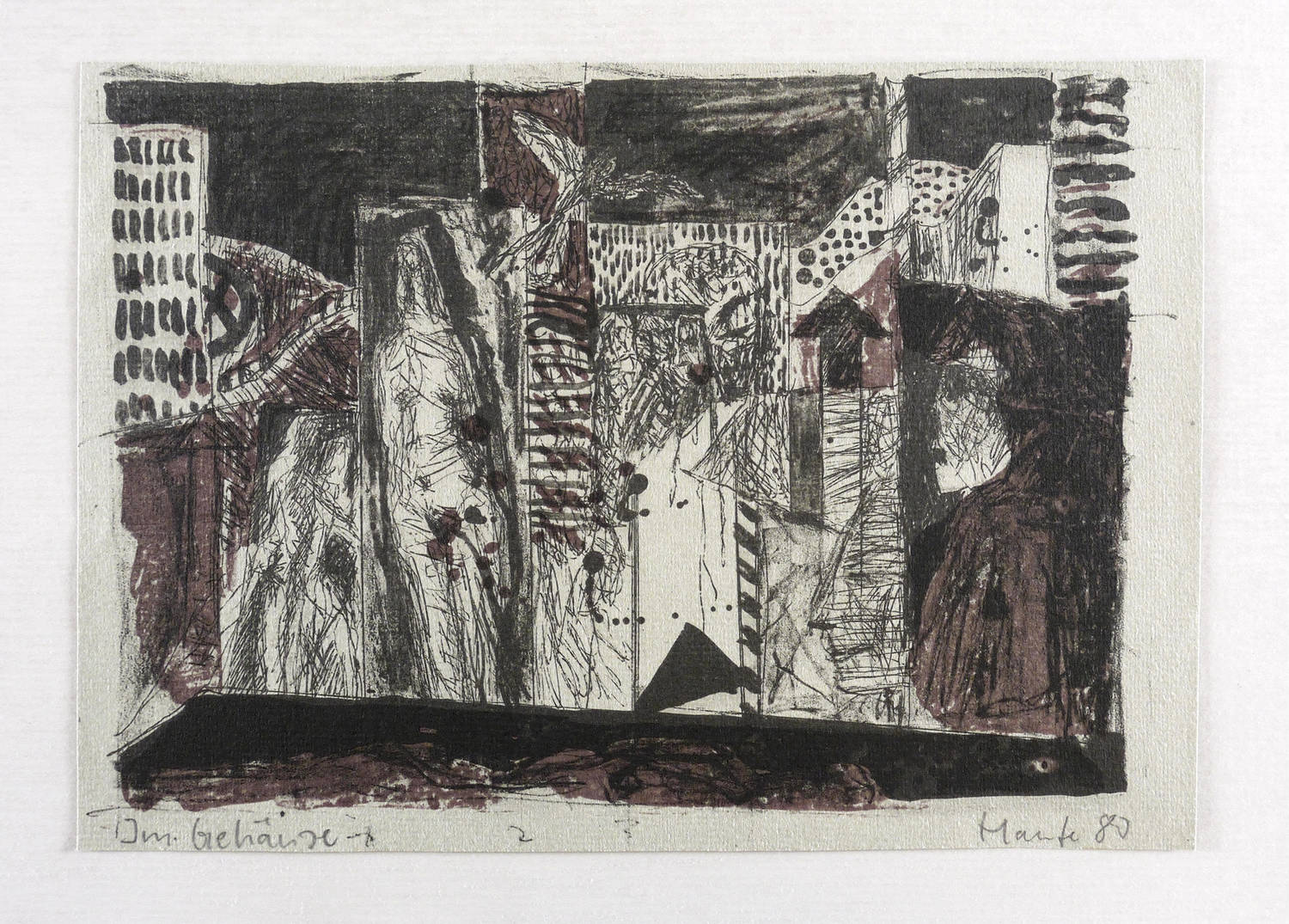 Rechts unten in Bleistift signiert und datiert: ″Haufe 80″. Links Titel: ″Im Gehäuse″. Verso Neujahrsgruß des Künstlers. – Originalrandiges Exemplar. Sehr guter Zustand.