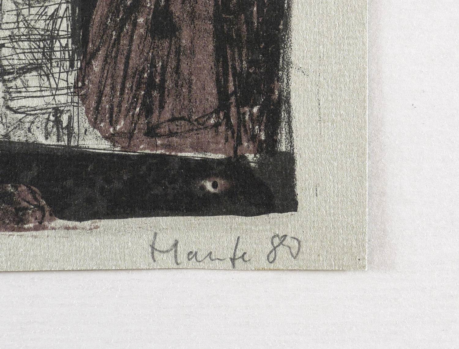 1980. Farblithografie / Feder- & Pinsellithografie, in Braun & Schwarz, auf hellgrauem Maschinenbütten. – Originale Künstlergrafik, von Jürgen Haufe. – 16 x 22 cm (Blatt), 14,5 x 20,0 cm (Darstellung / Druckbild).