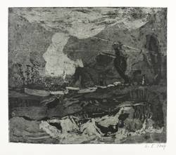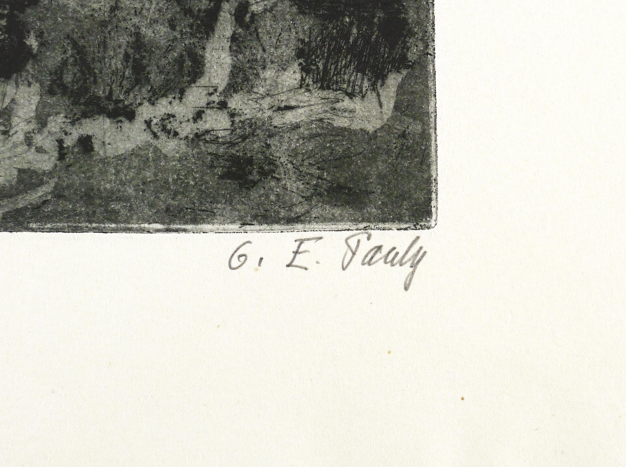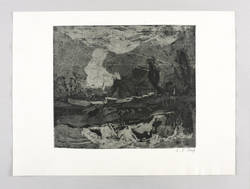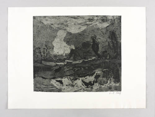 1960. Radierung / Aquatinta, in Schwarz, auf hellgelbem Kupferdruckkarton. – Originale Künstlergrafik, von Charlotte Elfriede Pauly. – Auflage Exemplar Nr. 42/82. – 28,1 x 32,2 cm (Darstellung / Platte), 38 x 51 cm (Blatt).