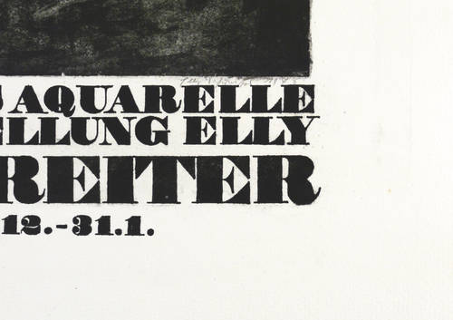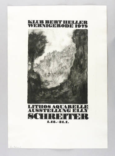 Rechts unten in Bleistift signiert und datiert: ″Elly Schreiter 78″. Diverse Inschriften im Stein. Blattecke links unten mit Widmung an den Drucker Michael Wackwitz. – Originalgrafisches Plakat zur Ausstellung ″Elly Schreiter. Lithos, Aquarelle″ 1978 im Klub Bert Heller in Wernigerode. – Sehr guter Zustand.