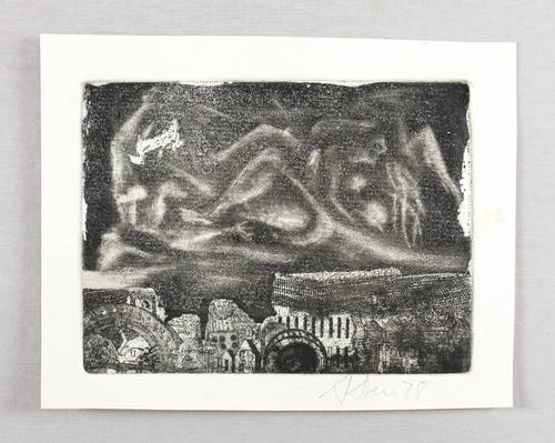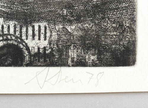 1978. Radierung / Strichätzung, Roulette & Aquatinta, in Schwarz, auf hartem hellchamois Weißenborn. – Originale Künstlergrafik, von Andreas Dress. – 12,3 x 16,2 cm (Darstellung / Druckbild), 16 x 20 cm (Blatt).