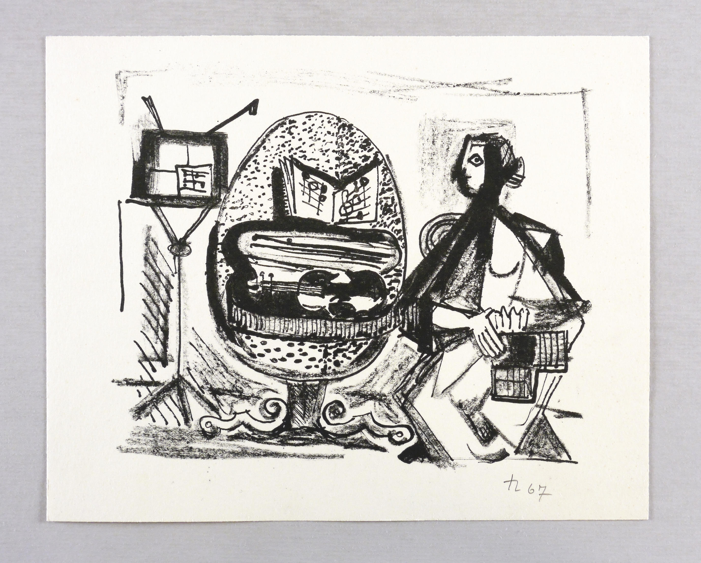 1967. Lithografie / Pinsel- und Kreidelithografie, in Schwarz, auf gelblichem Velinkarton. – Originale Künstlergrafik, von Joachim Heuer. – 16,4 x 19,2 cm (Darstellung / Druckbild), 20 x 25 cm (Blatt).