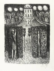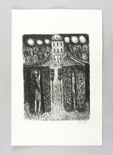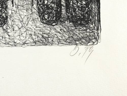 1979. Lithografie / Kreidelithografie, in Schwarz, auf hartem hellchamois Weißenborn. – Originale Künstlergrafik, von Werner Juza. – 38 x 25 cm (Blatt), 24,3 x 18,6 cm (Darstellung / Druckbild).