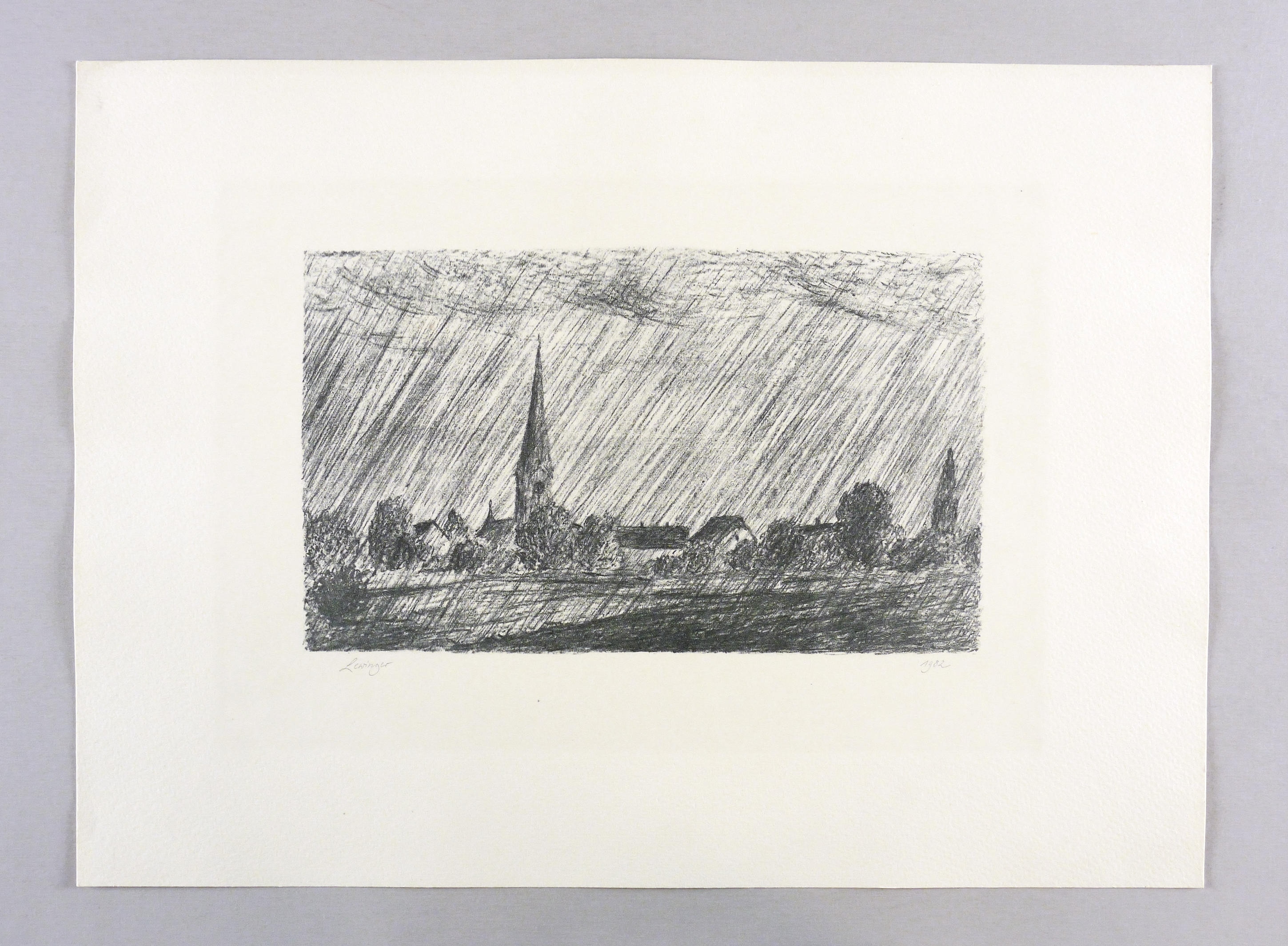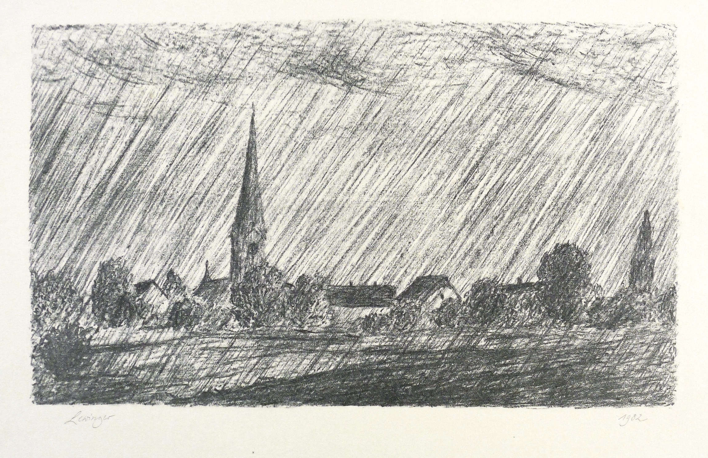 1982. Lithografie / Kreidelithografie, in Schwarz, auf hartem hellchamois Weißenborn. – Originale Künstlergrafik, von Ernst Lewinger. – 17,8 x 29,5 cm (Darstellung / Druckbild), 37 x 50 cm (Blatt).