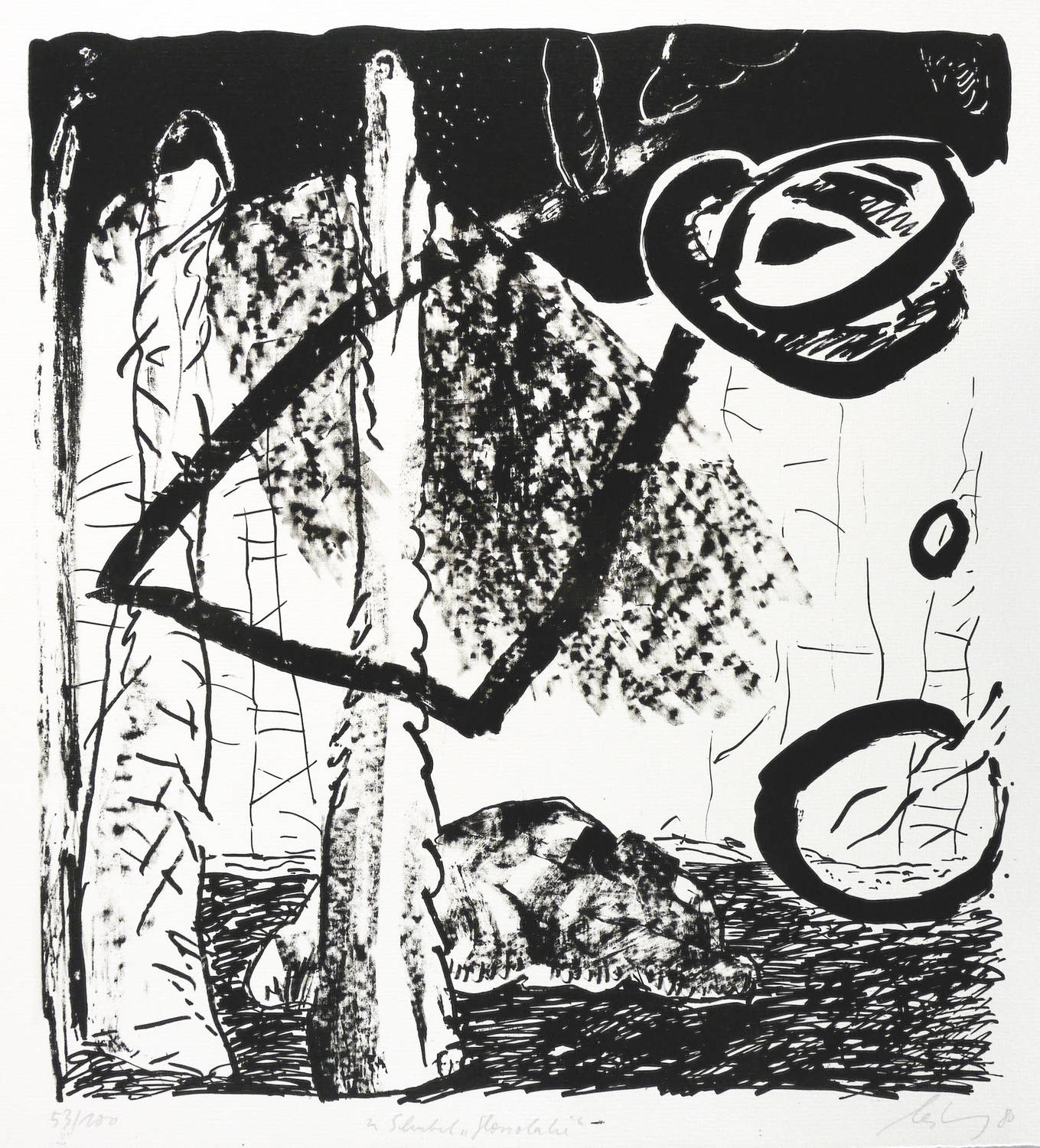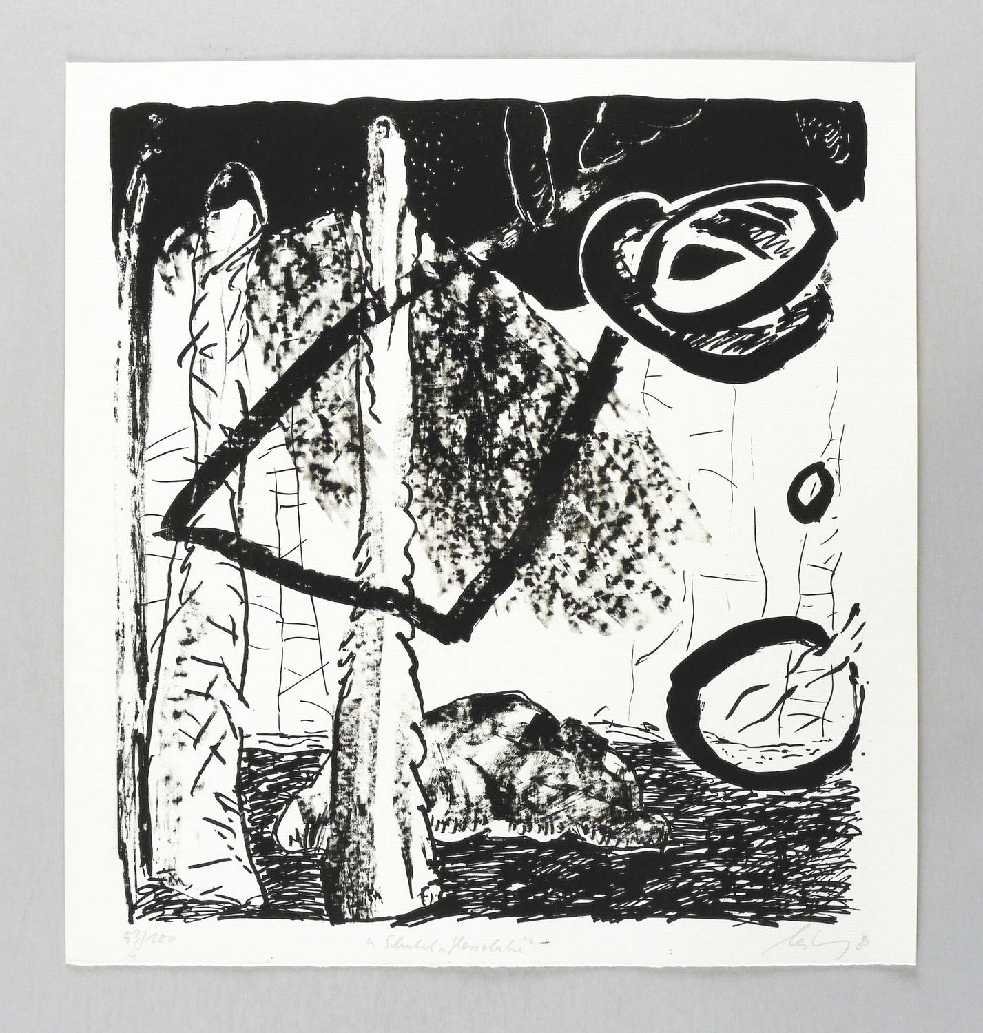 Rechts unten in Bleistift signiert und datiert: ″leiberg 80″. Links Auflagenbezeichnung: ″53/100″. Mittig Titel: ″zu Schnebel 'Glossolalie'″. – Zum Musikstück ″Glossolalie 61″ (1960-65) von Dieter Schnebel (1930-2018). – Tadellos erhalten. Sehr guter Zustand.