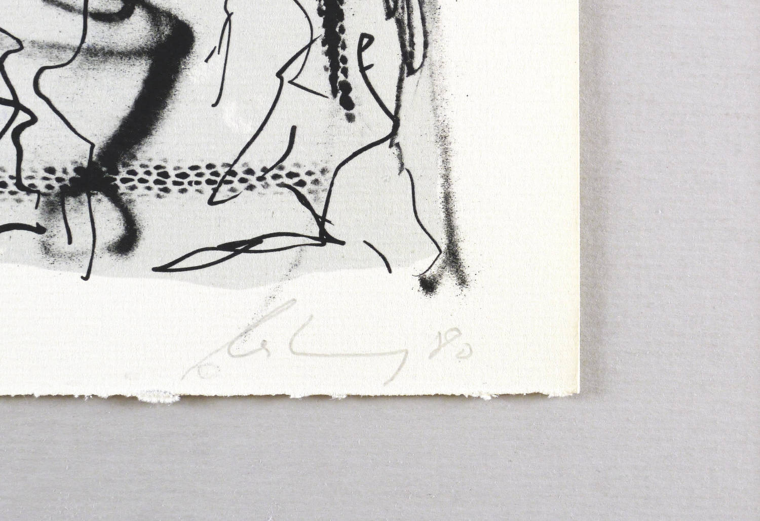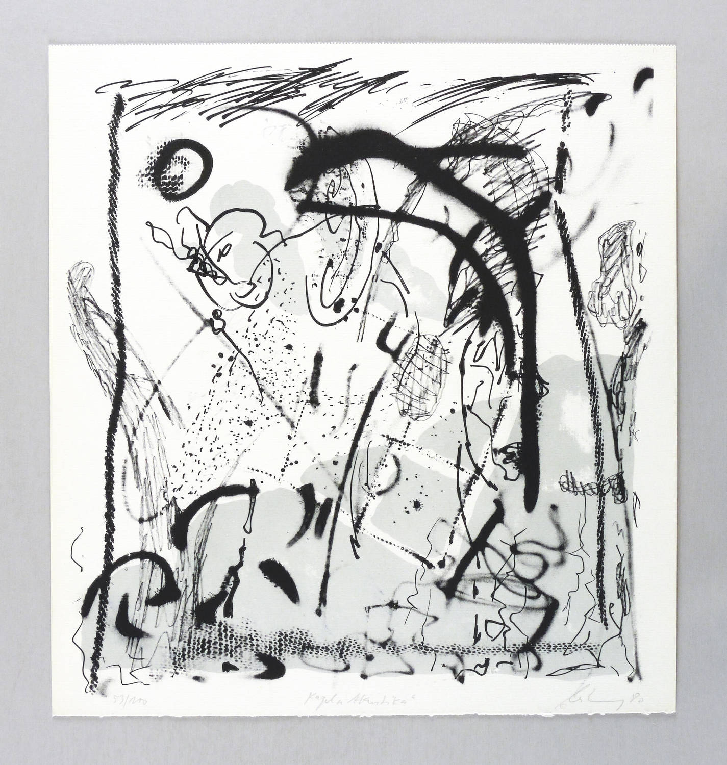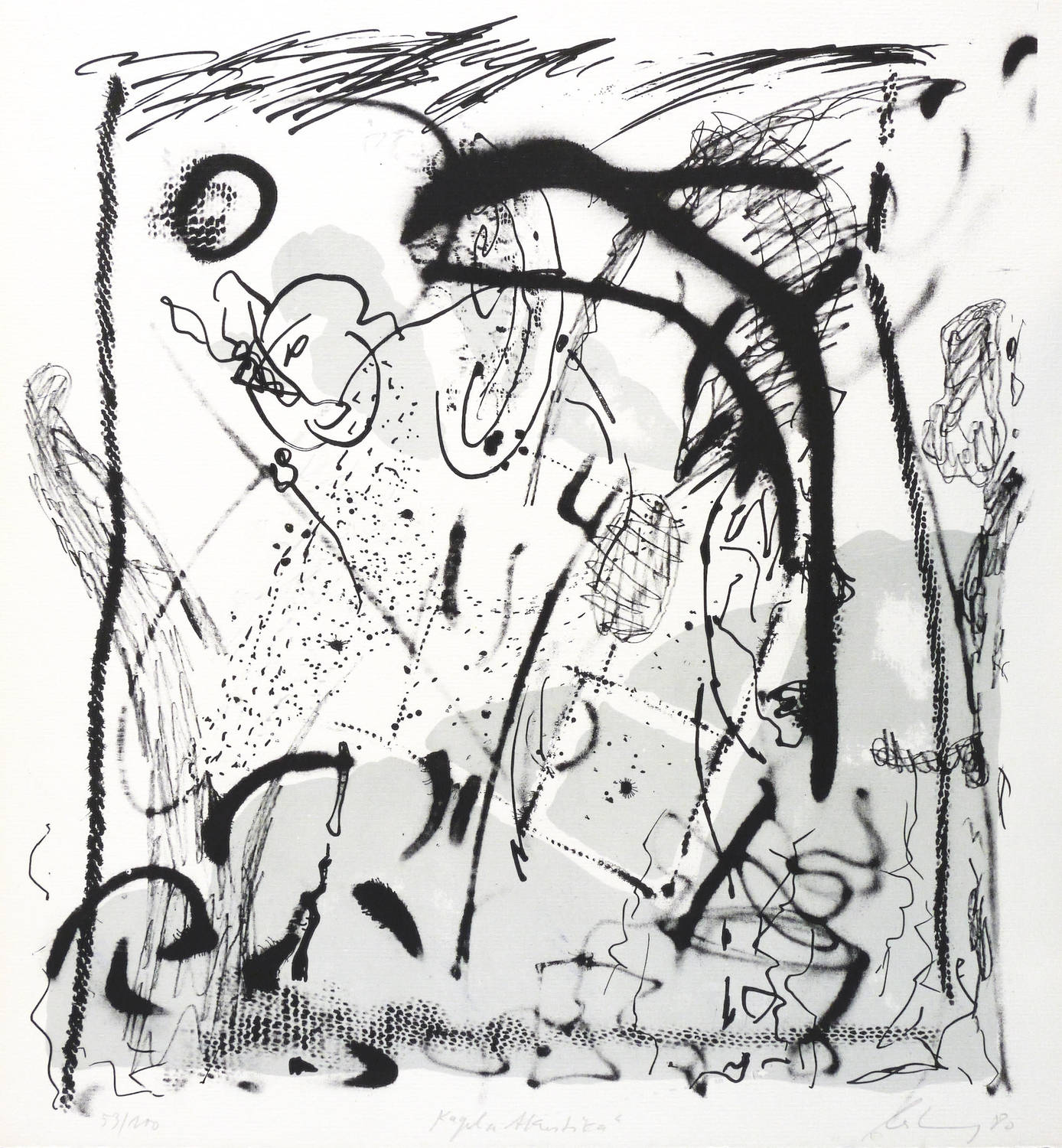 Rechts unten in Bleistift signiert und datiert: ″leiberg 80″. Links Auflagenbezeichnung: ″53/100″. Mittig Titel: ″zu Schnebel 'Glossolalie'″. – Zum Musikstück ″Acustica″ (1968-70) von Mauricio Kagel (1931-2008). – Tadellos erhalten. Sehr guter Zustand.