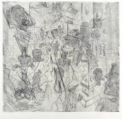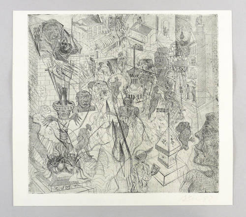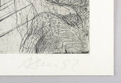 1982. Radierung / Strichätzung, in Schwarz, auf hartem hellchamois Weißenborn. – Originale Künstlergrafik, von Andreas Dress. – 39,6 x 41,7 cm (Darstellung / Platte), 43 x 48 cm (Blatt).