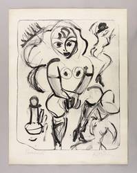 Um 1980. Lithografie / Pinsel- & Kreidelithografie, in Schwarz, auf gelbem Velinkarton. – Originale Künstlergrafik, von Helmut Schmidt-Kirstein. – Probedruck. – 48,0 x 34,4 cm (Darstellung / Stein), 65 x 50 cm (Blatt).