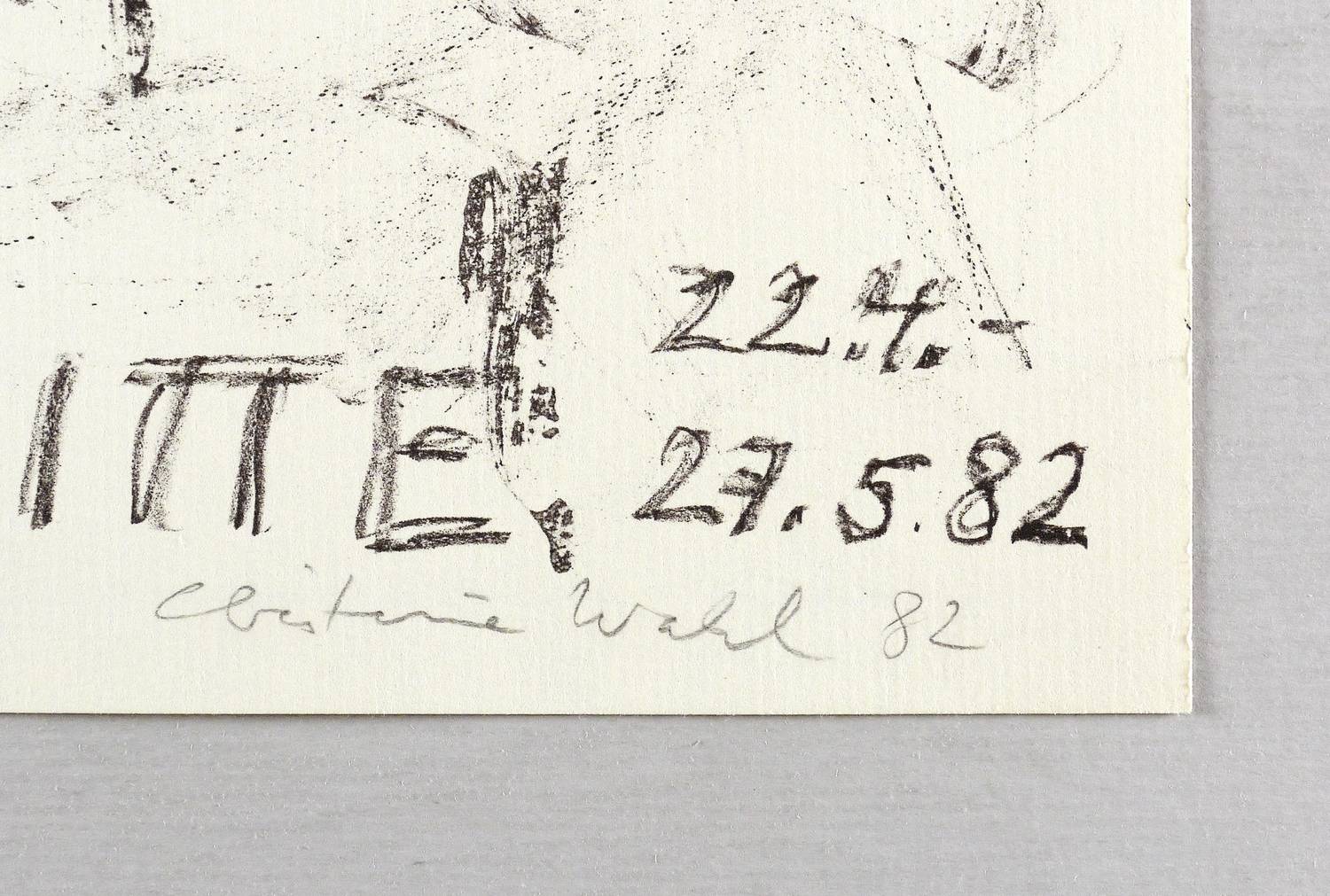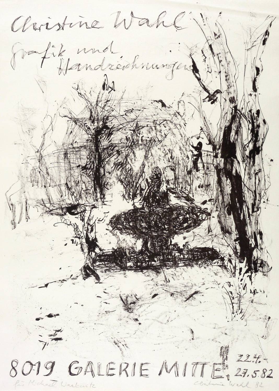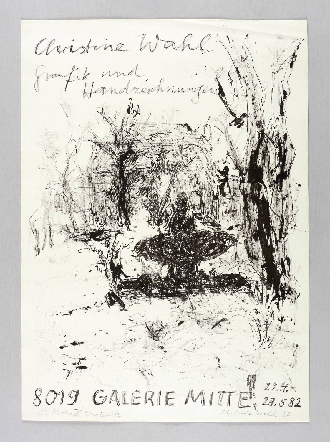 Rechts unten in Bleistift signiert und datiert. Links Widmung an den Drucker Michael Wackwitz. – Originales Künstlerplakat zur Ausstellung ″Christine Wahl. Grafik und Handzeichnungen″ 1982 in der Galerie Mitte in Dresden. – Sehr guter Zustand.