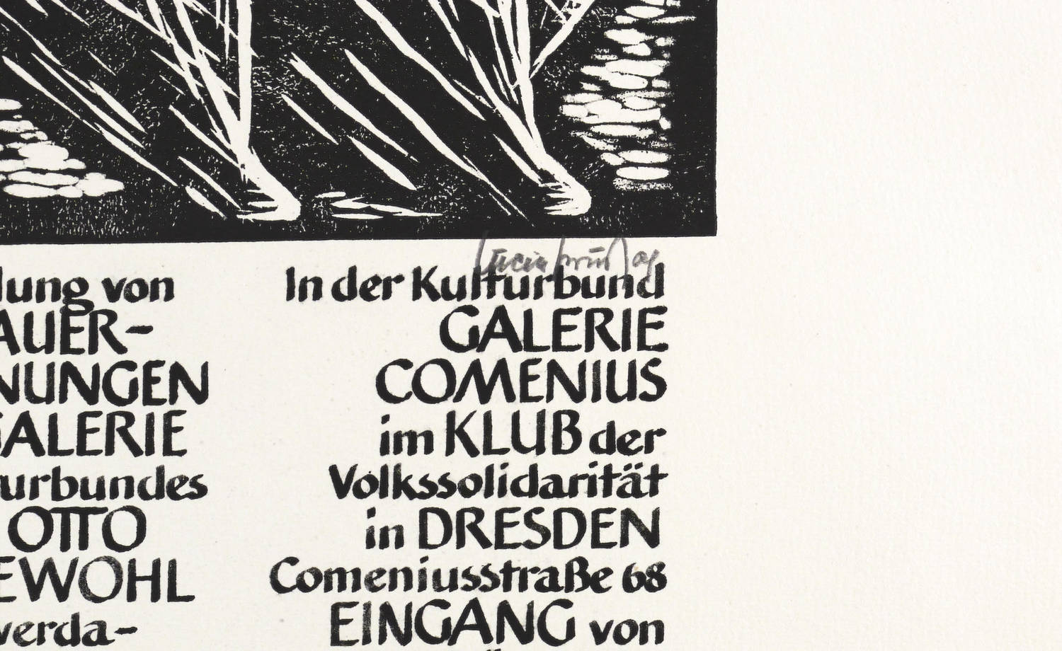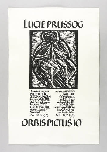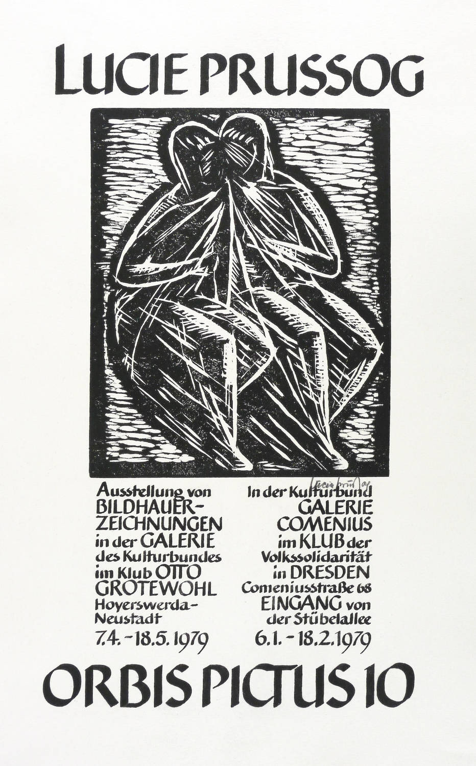 Rechts unter der Darstellung in Bleistift signiert: ″Lucie Prussog″. Diverse Inschriften. – Originalgrafisches Künstler-Plakat zur Ausstellung ″Lucie Prussog. Bildhauerzeichnungen″ 1979 in der Galerie des Kulturbundes Hoyerswerda und in der Galerie Comenius im Klub der Volkssolidarität Dresden (Reihe Orbis Pictus 10). – Sehr guter Zustand.