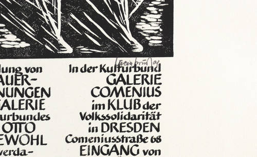 1979. Holzschnitt, in Schwarz, auf festem hellchamois Weißenborn. – Originales Künstlerplakat, von Lucie Prussog. – 27,0 x 22,0 cm (Darstellung / Druckstock), 62 x 42 cm (Blatt).