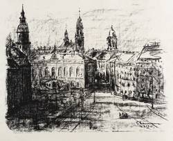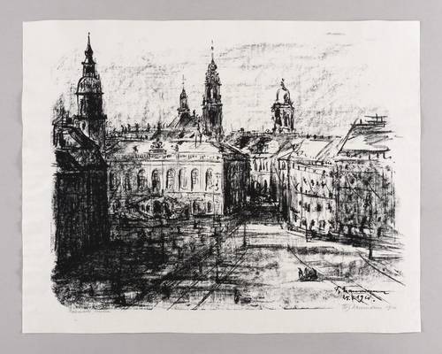 In Bleistift signiert und datiert unten rechts: ″Fritz Naumann 1921″. Links bezeichnet: ″Neumarkt, Dresden″. Im Stein nochmals rechts unten Signatur und Datum: ″F. Naumann / 25.7.1921.″ – Blick auf den Neumarkt Richtung Johanneum. – Sehr guter Zustand.
